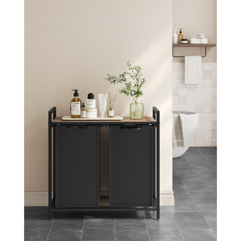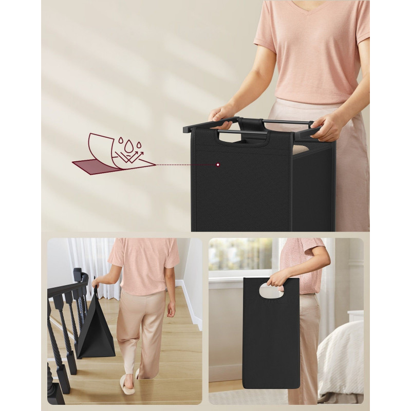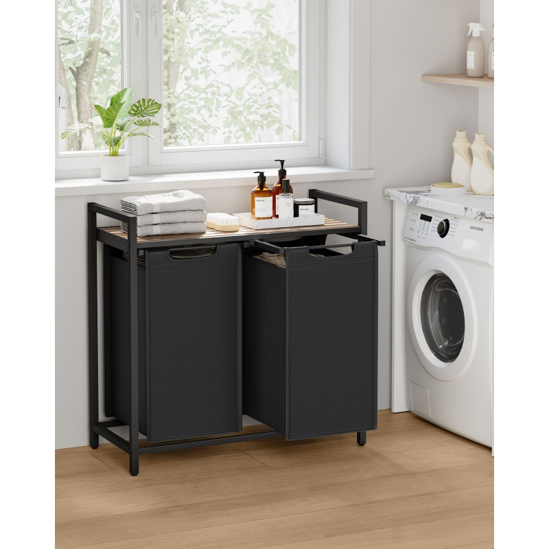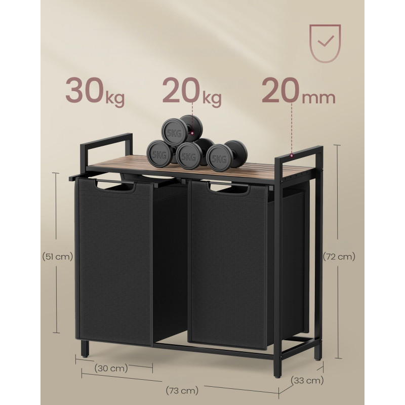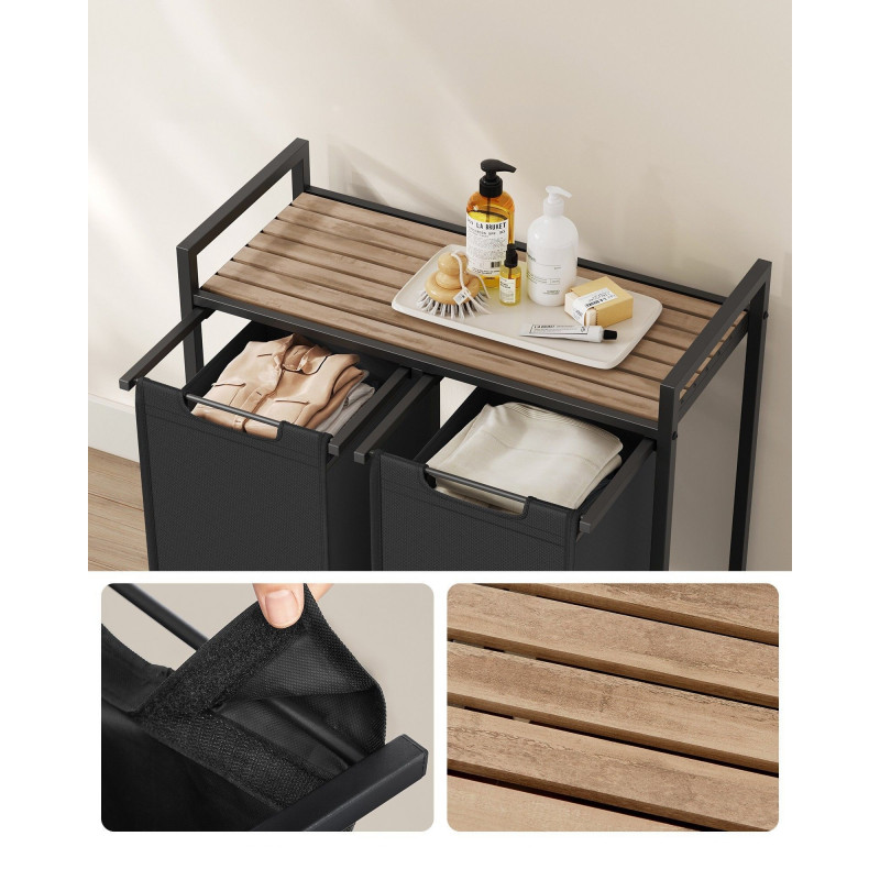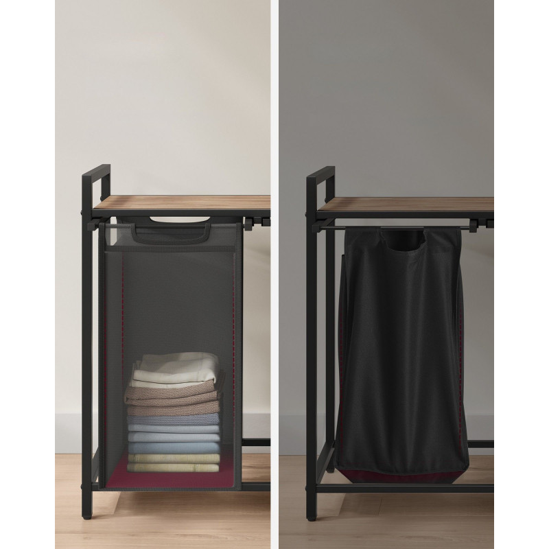 Scurta descriere Cos de rufe cu doua compartimente, conceput pentru sortarea eficienta a hainelor deschise si inchise la culoare. Include doi saci textili detasabili, prevazuti cu panou rigid la baza pentru stabilitate si manere pentru transport facil catre masina de spalat. Raftul superior ofera spatiu suplimentar pentru detergenti sau accesorii, iar designul cu lamele permite ventilarea continutului si prevenirea mirosurilor neplacute. Structura metalica asigura stabilitate si utilizare indelungata.