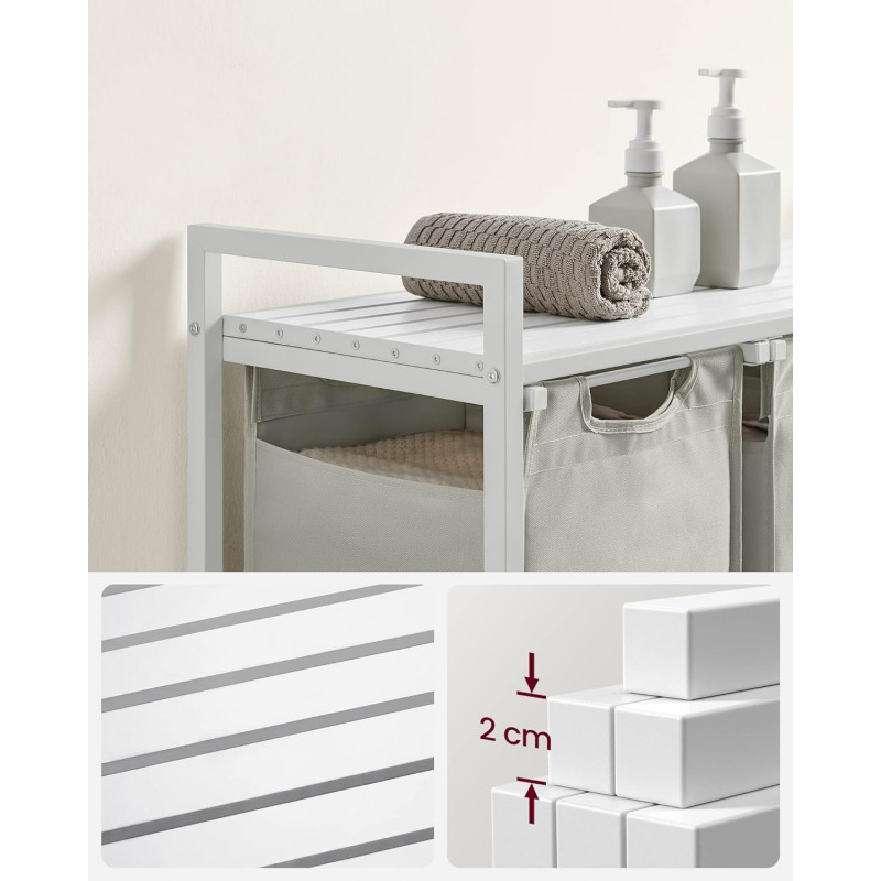 Cu raft: Raftul cosului de rufe ofera spatiu suplimentar pentru detergent de rufe sau articole de toaleta; designul sipcilor asigura o circulatie optima a aerului pentru a tine la distanta mirosurile nedorite. Saci de rufe - extensibile si detasabile: Sustinuti cu o placa de baza din plastic, pungile nu atarna si au elemente de fixare convenabile cu velcro, astfel incat sa le puteti scoate cu usurinta pentru a duce rufele la masina de spalat. Solid, stabil si durabil: Tuburi solide de otel de 2 x 2 cm, panouri MDF de inalta calitate - cosul de rufe este robust si rezistent (raft pana la 20 kg). Gentile sunt confectionate din material Oxford hidrofug. Cele 4 picioare reglabile sporesc stabilitatea.