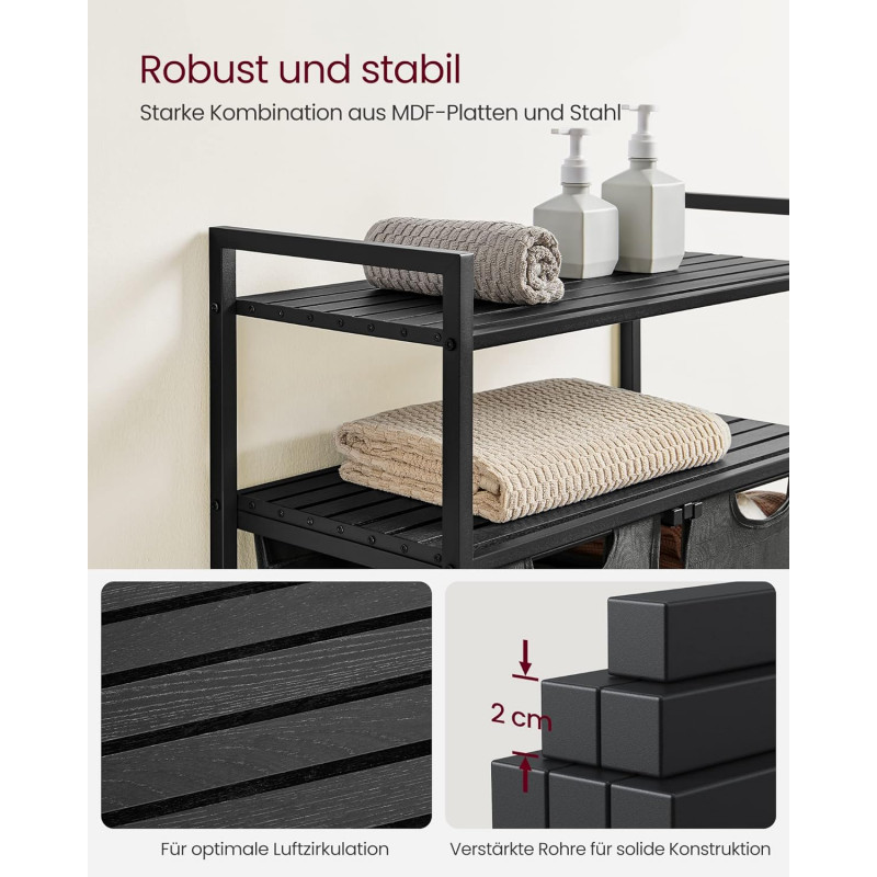 Capacitatea de incarcare statica a fiecarui raft: 20 kg Despre acest articol Capacitatea totala a acestui sistem de sortare a rufelor: 92 litri (per compartiment 46 litri). Cele 2 compartimente va ajuta sa va depozitati rufele separat pe culori sau tipuri de rufe.Rafturi duble, spatiu dublu de depozitare pentru detergentii dvs., articolele de toaleta etc.; designul cu lamele asigura o circulatie optima a aerului pentru a evita mirosul de la rufele murdare.Sustinuti cu o placa de baza din plastic, sacii au inchizatori comode cu Velcro, astfel incat ii puteti scoate sau indeparta cu usurinta pentru a duce rufele la masina de spalat rufe.Tuburi solide din otel de 2 x 2 cm, panouri MDF de inalta calitate - sortatorul de rufe este solid si rezistent. Sacii sunt confectionati din tesatura Oxford hidrofuga. Cele 4 picioare reglabile sporesc stabilitatea.Asezati cosul de rufe in spalatorie, baie sau dormitor. Cele 2 buzunare si 2 rafturi va ajuta sa depozitati rufele la vedere, pastrand in acelasi timp obiectele esentiale la indemana.