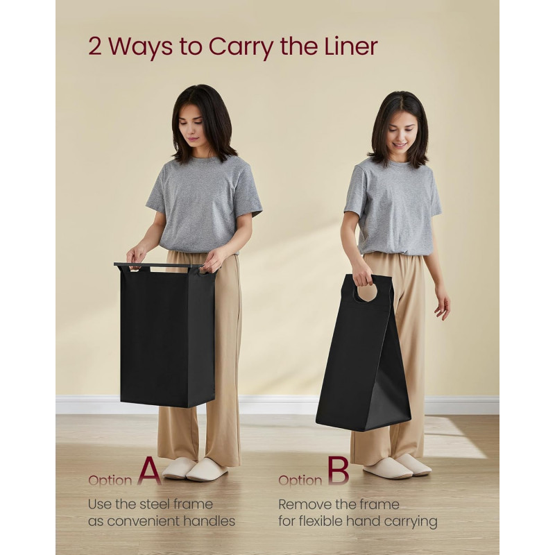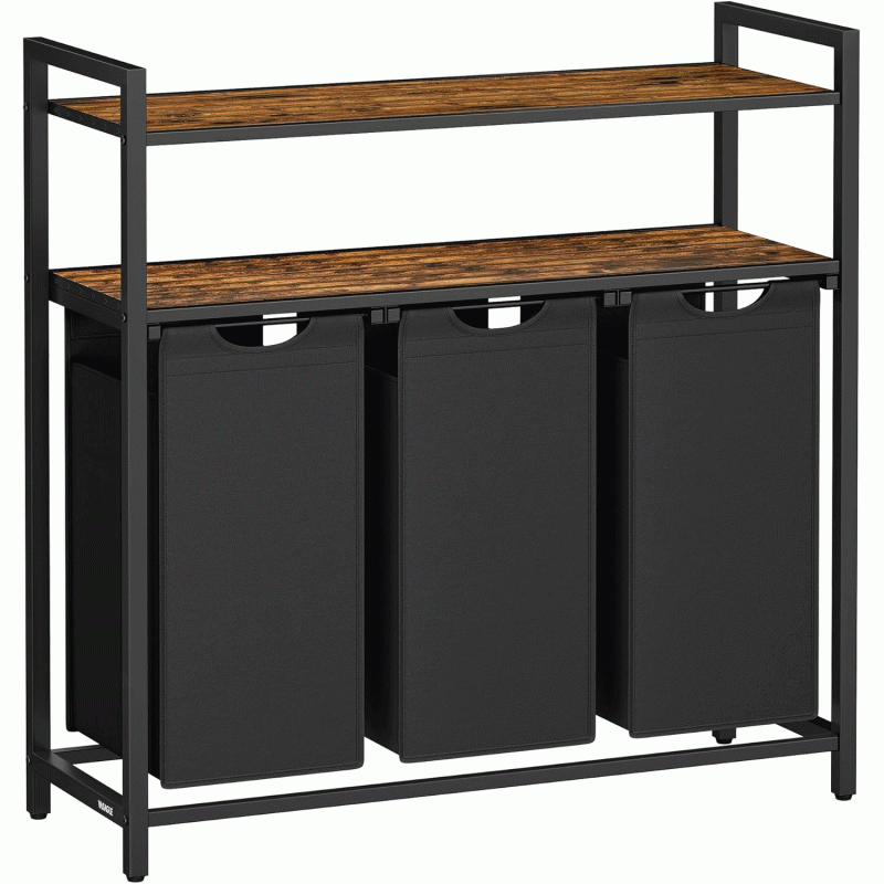 Scurta descriere: Cosul de rufe VASAGLE cu 3 compartimente permite sortarea eficienta a hainelor inainte de spalare. Saci detasabili din material Oxford, rezistent la umezeala, pot fi scosi si transportati usor, iar cele doua rafturi superioare ofera spatiu suplimentar pentru detergenti sau accesorii. Designul industrial se potriveste perfect in spatii moderne.
