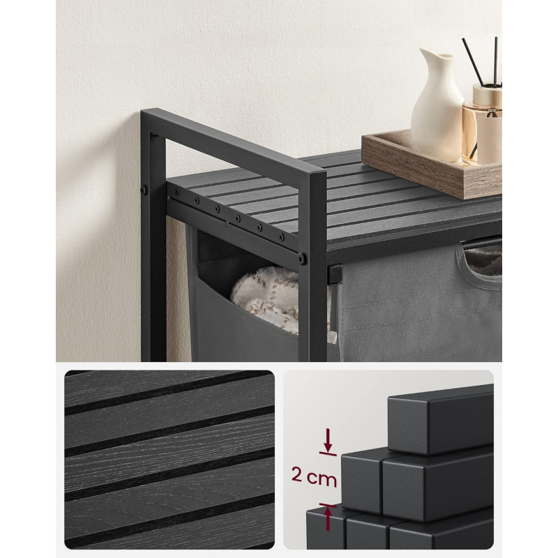 Captuseala extrasa si detasabila: Captuseala este echipata cu un panou inferior din plastic pentru a preveni caderea si, datorita dispozitivului de fixare cu carlig si bucla, puteti scoate si indeparta fara efort captuseala pentru a o transporta cu usurinta la masina de spalat.Fabricat cu un cadru din tub de otel de 2 cm si panou MDF, acest cos de rufe suporta pana la 20 kg pe raftul superior. In plus, captuseala este confectionata din material Oxford hidrofug, iar cele patru picioare reglabile asigura stabilitate
