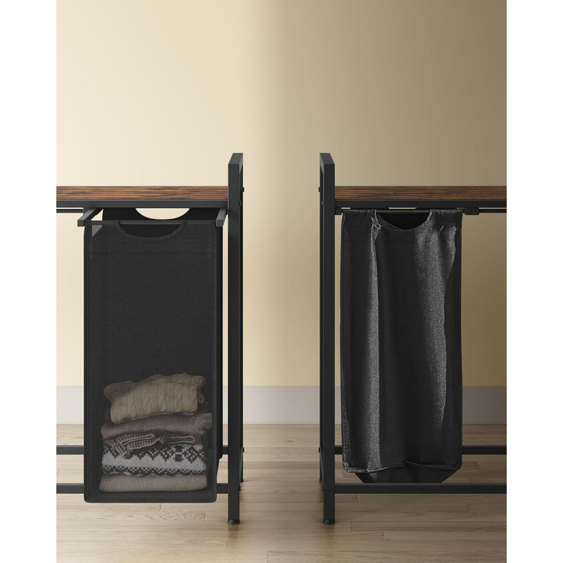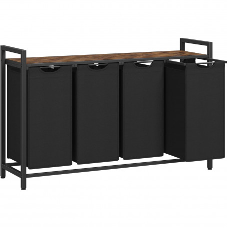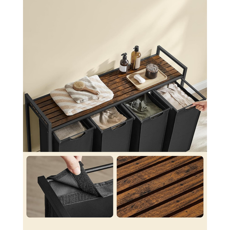 Scurta descriere: Organizeaza-ti eficient hainele cu acest cos de rufe VASAGLE cu 4 compartimente. Fiecare sac textil detasabil are o capacitate de 40 L si permite sortarea rufelor inainte de spalare. Raftul superior este ideal pentru produse de curatenie sau obiecte utile in baie sau spalatorie. Structura robusta din otel si MDF asigura stabilitate, iar designul vintage se potriveste perfect in orice decor modern.