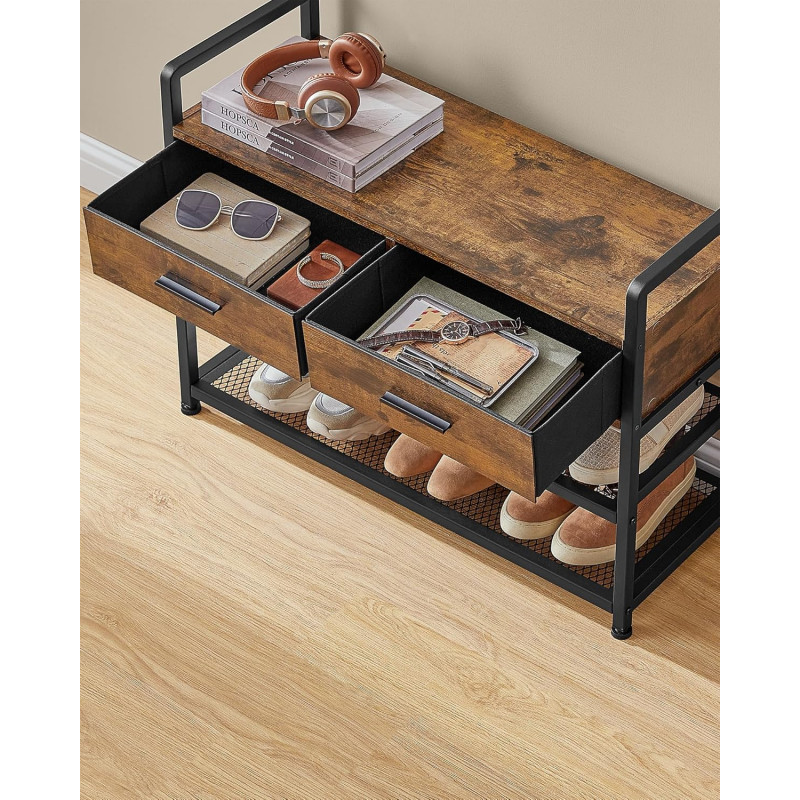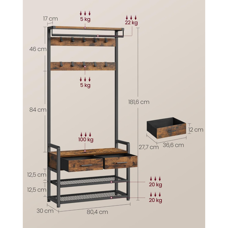Capacitatea maxima de incarcare statica a cuierului este de 100 kg. Va rugam sa nu depasiti aceasta greutate maxima. Despre acest articol Design 6 in 1: Suportul pentru haine combina 10 carlige pentru haine, 2 sertare, o bara pentru haine, o banca, un suport pentru pantofi si un raft pentru a va optimiza spatiul si a va ajuta sa creati o intrare ordonata si functionala.