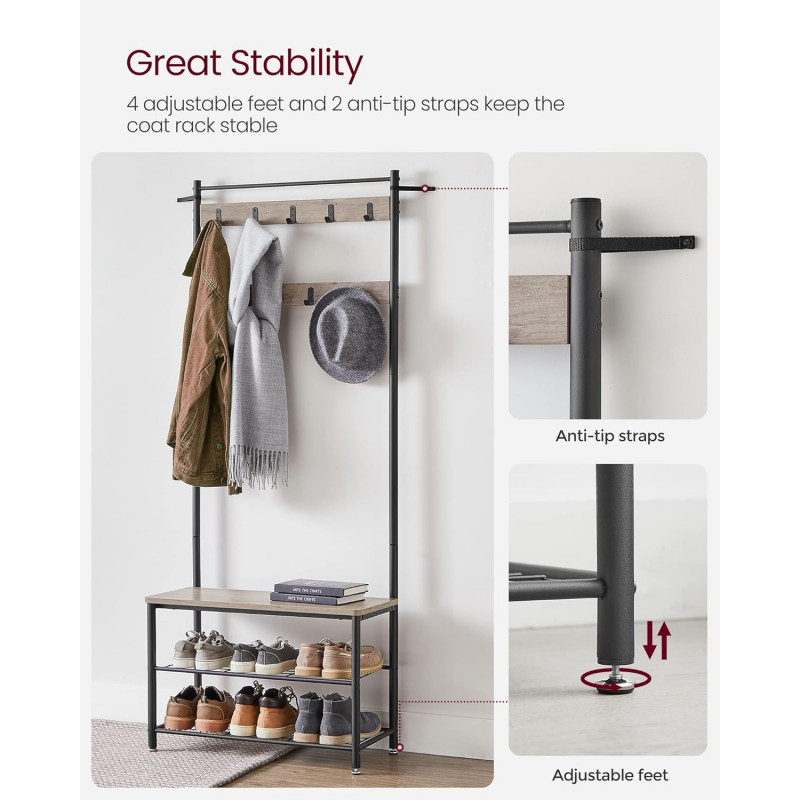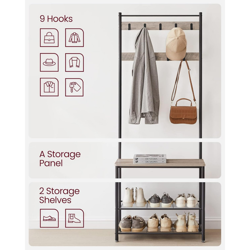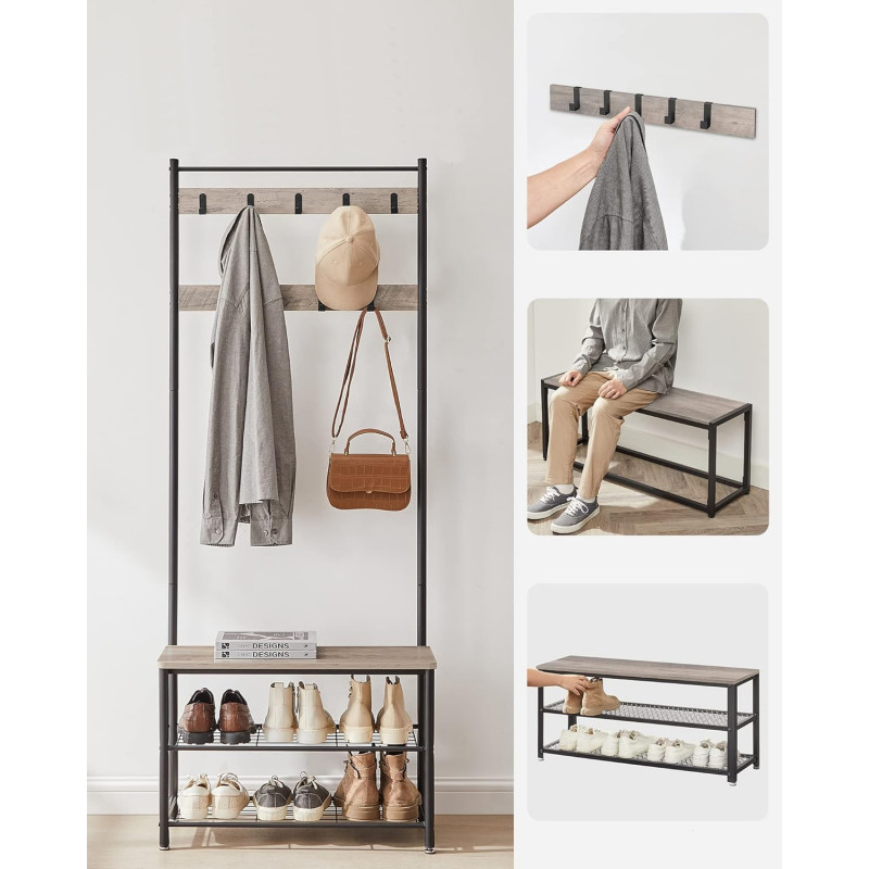 Scurta descriere: Cuierul multifunctional VASAGLE este solutia completa pentru organizarea holului. Cu 9 carlige dispuse pe doua randuri, o banca solida si doua rafturi metalice pentru pantofi, acest cuier 3 in 1 imbina eficient stilul industrial cu utilitatea. Structura din otel si PAL ofera stabilitate, iar banca permite asezarea confortabila in timp ce te incalti.