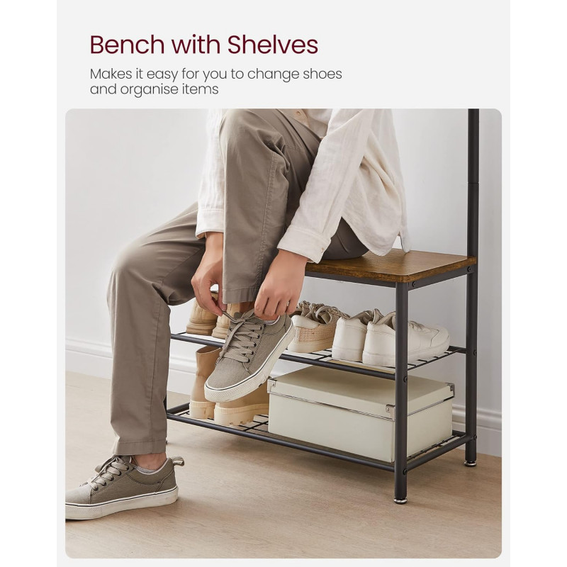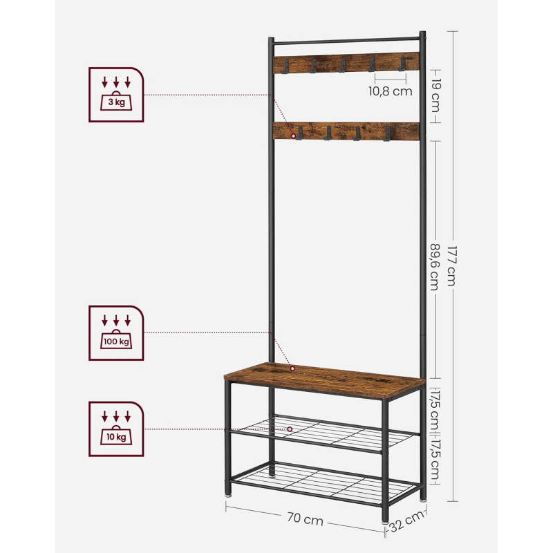 Marca VASAGLECuloare maro rustic + negru Material otel Utilizari recomandate pentru produsul Paltoane, haine, palarii, pantofi Dimensiunile produsului 32 D x 70 L x 177 H centimetri Despre acest articol 3 in 1. Carlige pentru paltoane, o banca pentru pantofi si un suport pentru pantofi - aceasta unitate de depozitare multifunctionala pentru hol se potriveste de una singura pentru toate nevoile dvs. de a agata haine, de a organiza pantofii si de a va aseza pentru a va incalta sau a va scoate pantofii 9 carlige metalice rezistente la rugina in 2 randuri, fiecare suportand pana la 3 kg, sunt robuste si durabile, oferind o multime de spatiu de agatat pentru paltoane, genti, palarii, esarfe si alte articole de dus-intors - perfecte pentru utilizare pe termen lung Sustinut de un cadru robust din otel si nivelat de 4 picioare reglabile, acest suport de haine pentru hol ofera un suport stabil pentru obiectele dvs.; kitul anti-inclinare inclus imbunatateste stabilitatea generala Bancuta acestui suport pentru haine va permite sa va asezati cu usurinta datorita capacitatii de greutate de 90 kg. De asemenea, il puteti folosi ca raft de depozitare pentru a oganiza cutiile de pantofi si cosurile de depozitare sau pentru a expune plante si decoratiuni Datorita structurii simple, a pieselor numerotate si a