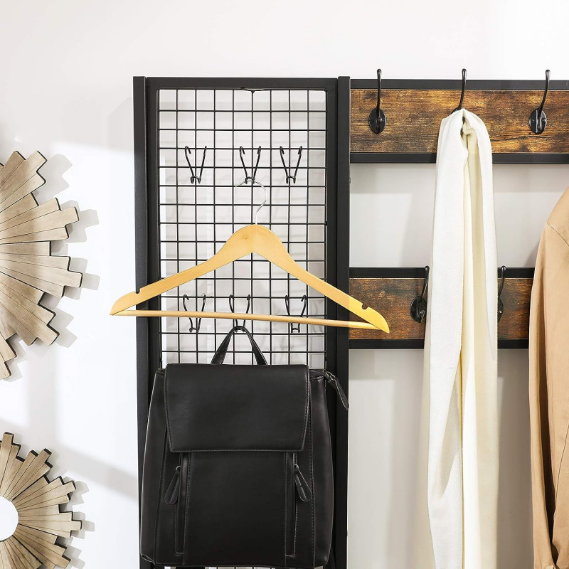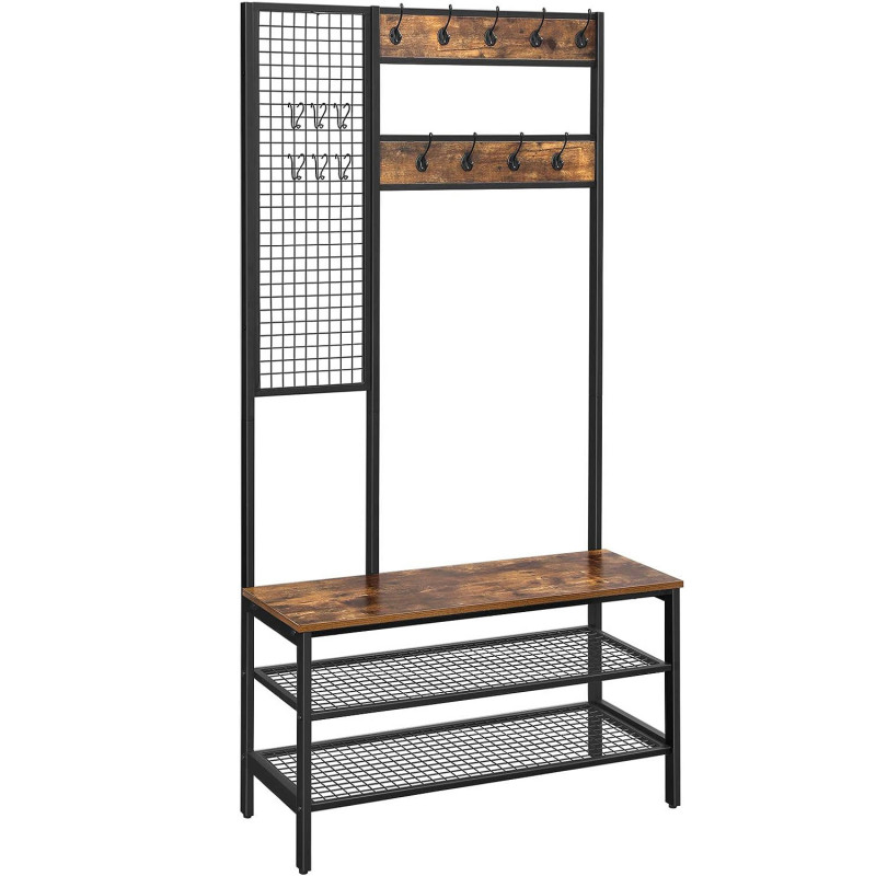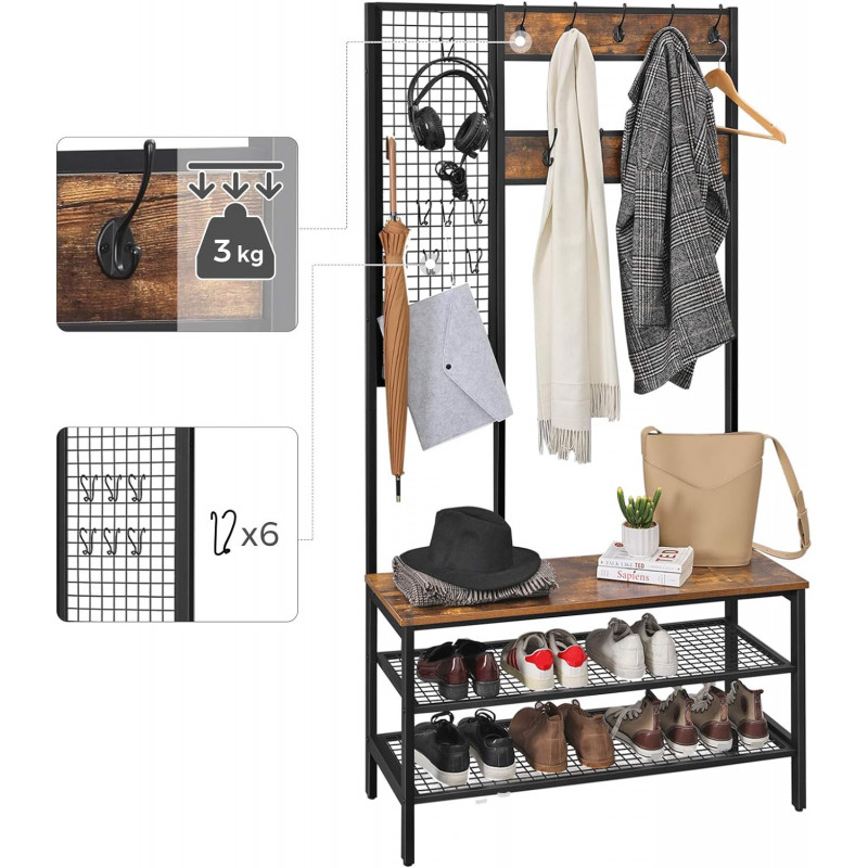 Dimensiunile produsului 40 D x 97,7 W x 185 H centimetri Despre acest articol 1 suport pentru pantofi, 2 grile, 3 optiuni: Pe cele doua rafturi rezistente cu grila ale acestui suport pentru haine puteti depozita o varietate de pantofi. Raftul inferior al grilajului este, de asemenea, la 12,5 cm distanta de sol, deci exista spatiu si dedesubt.Agatati-va jachetele de cele 9 carlige fixe sau folositi cele 6 carlige mobile pentru a agata esarfe, genti sau alte accesorii pe grila practica.Multifunctionalitatea: Doar atunci cand o piesa de mobilier are mai multe functii, ne-am facut treaba. Acest suport pentru haine are o banca integrata care poate sustine pana la 100 kg.