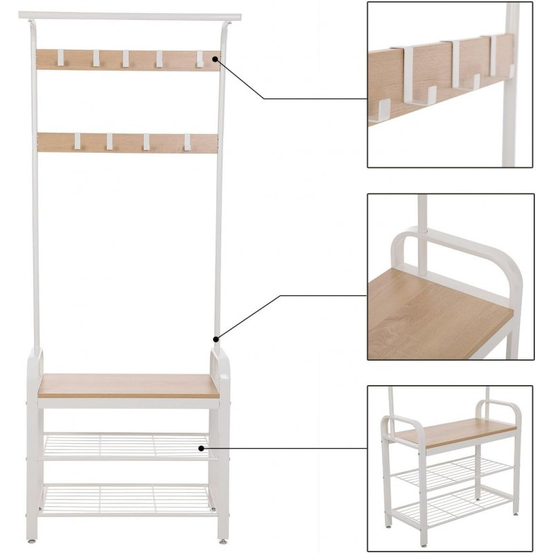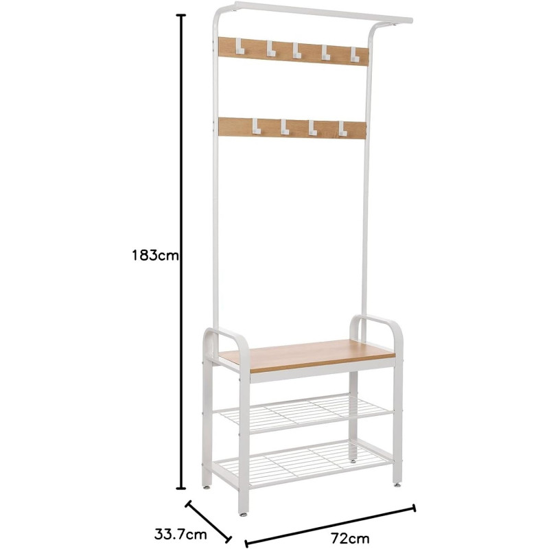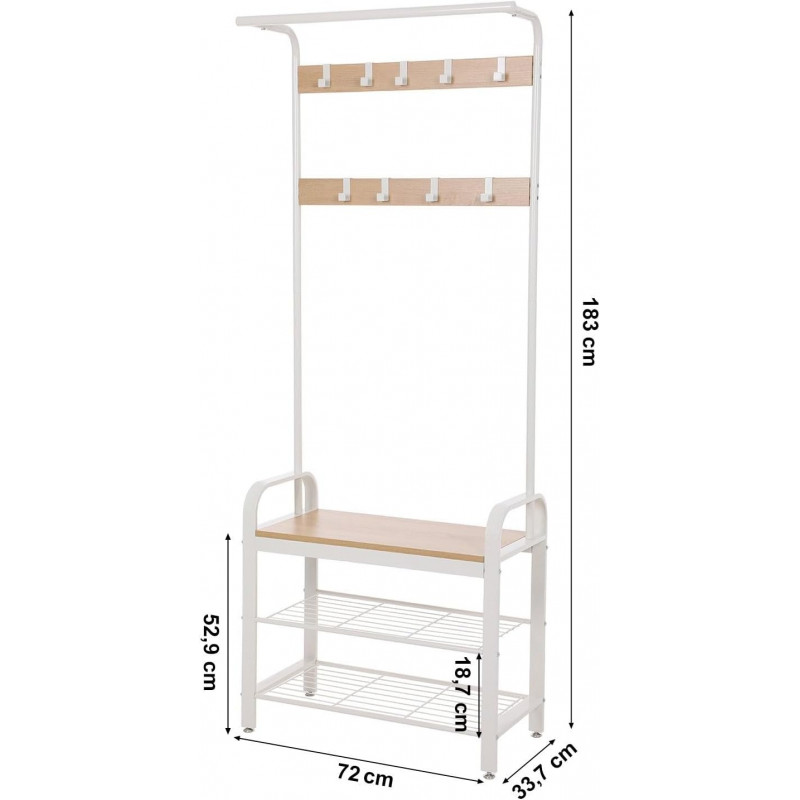 Culoare Stejar + Crem Marca VASAGLETip de camera Intrare Dimensiuni 33,7 x 72 x 183 cm Dimensiunile articolului L x l x a x h 33,7 x 72 x 178 centimetri Greutatea articolului 9,85 Kilograme Stil Modern Necesita asamblare Forma Dreptunghiulara Despre acest articol 4 in 1. Aceasta unitate de depozitare pentru hol combina o bara de agatat, o banca pentru pantofi, un suport pentru pantofi si carlige pentru haine pentru a satisface diversele dvs. nevoi - de la agatarea hainelor, organizarea pantofilor si asezarea confortabila pentru a schimba pantofii Balustrada superioara robusta si stabila pentru haine a acestui suport pentru haine maximizeaza spatiul vertical, permitandu-va sa atarnati esarfe si umbrele sau sa adaugati umerase pentru a agata mai multe haine Acest suport de haine pentru hol este prevazut cu 9 carlige detasabile pe 2 randuri, ajutandu-va sa agatati articole de diferite dimensiuni. Fabricate din metal robust si rezistent la rugina, sunt pentru utilizare pe termen lung Cadrul robust din otel, picioarele cu latimea de 3,8 cm si placile aglomerate de calitate creeaza acest suport robust pentru haine, a carui banca de depozitare a pantofilor suporta pana la 90 kg, pentru ca dvs. sa va asezati linistit; kitul anti-inclinare contribuie la stabilitatea generala Datorita pieselor numerotate, a