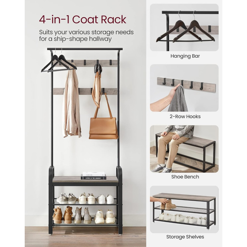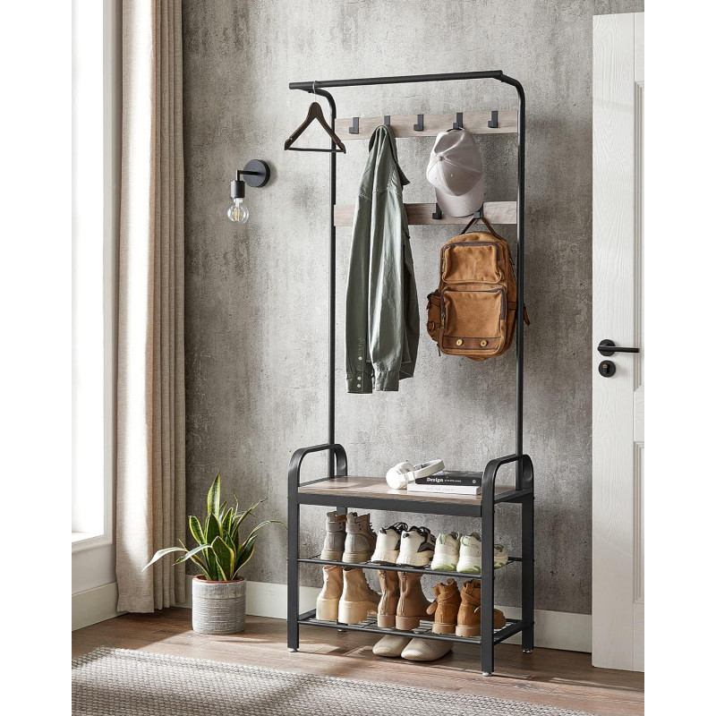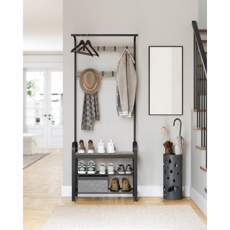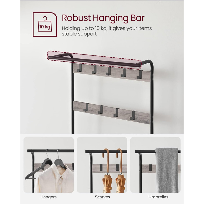 Design perfect: Cadrul puternic din otel negru si raftul masiv in tonuri de gri sunt combinatia eleganta de stiluri care confera acestui raft atractiv un caracter individual, o durabilitate remarcabila si o capacitate de incarcare ridicata de pana la 3 kg pentru fiecare carlig si 80 kg pentru raftul din lemn prelucrat.Acest cuier pentru palarii si paltoane nu numai ca are 9 carlige solide si o bara pentru haine in partea superioara, dar ofera si doua rafturi din sarma metalica pentru pantofii dvs. si o banca solida pe care va puteti aseza confortabil in timp ce va incaltati.Nu va faceti griji cu privire la asamblare:Datorita