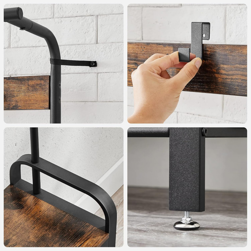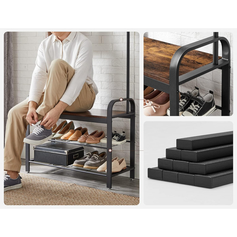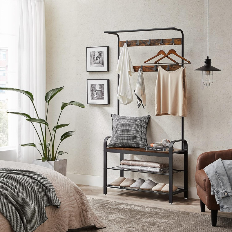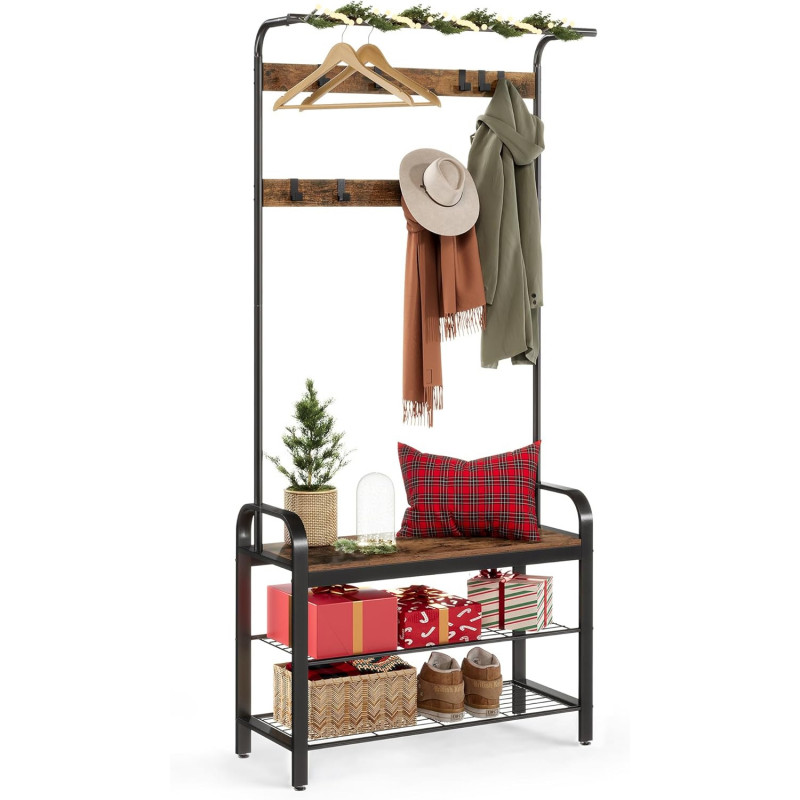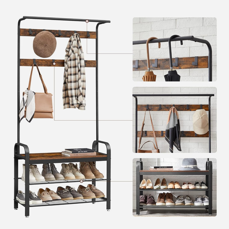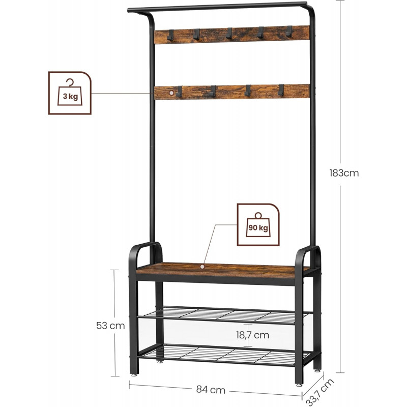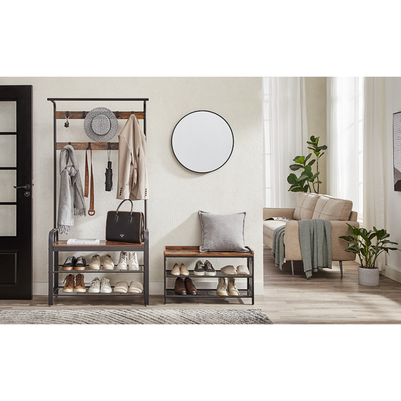 Scurta descriere: Organizeaza eficient holul cu acest cuier multifunctional, care combina spatiul pentru haine, incaltaminte si o banca practica. Designul industrial adauga un plus de stil si functionalitate locuintei tale.
