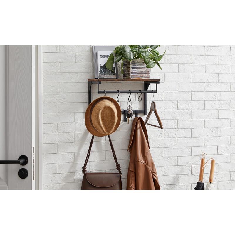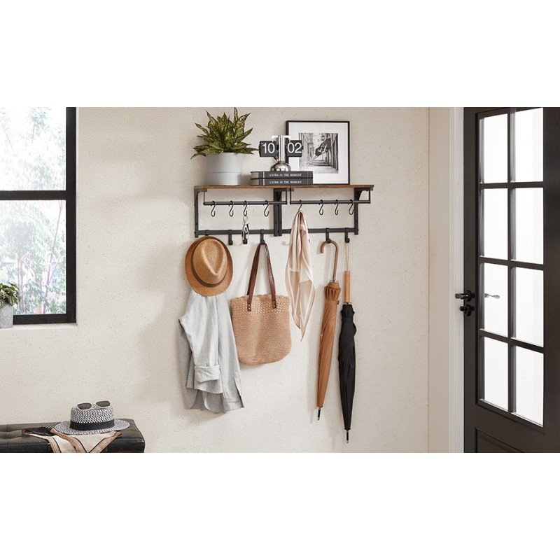 Scurta descriere: Cuierul de perete VASAGLE combina functionalitatea cu un design industrial atragator. Realizat din PAL si cadru metalic robust, include o polita superioara, bara pentru esarfe sau umerase si 8 carlige flexibile pentru haine, chei sau accesorii. Perfect pentru hol, dormitor sau spatiu de utilitate, acest cuier optimizeaza spatiul si aduce un plus de stil.