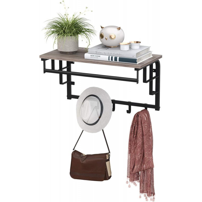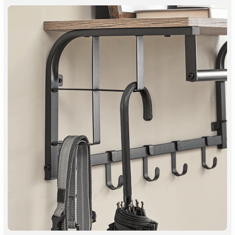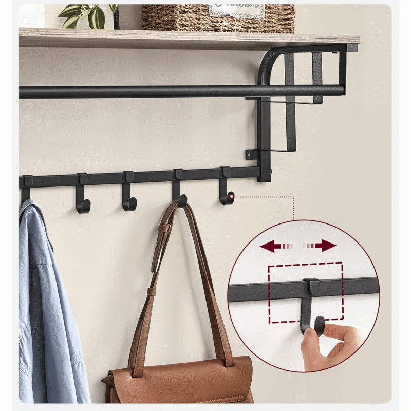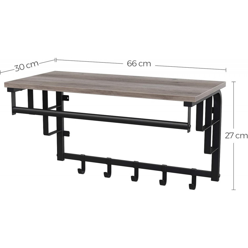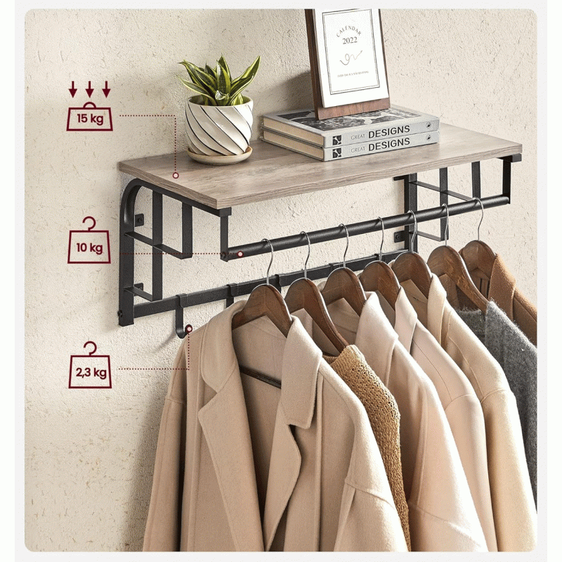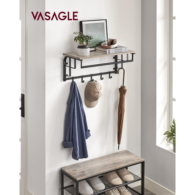 Scurta descriere: Cuierul de perete VASAGLE combina un design modern cu functionalitate practica. Include o polita eleganta, bara pentru haine si 5 carlige detasabile, ideale pentru genti, chei sau umbrele. Materialele de calitate si constructia robusta asigura durabilitate, iar montajul este rapid datorita