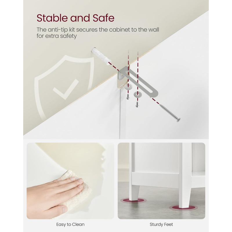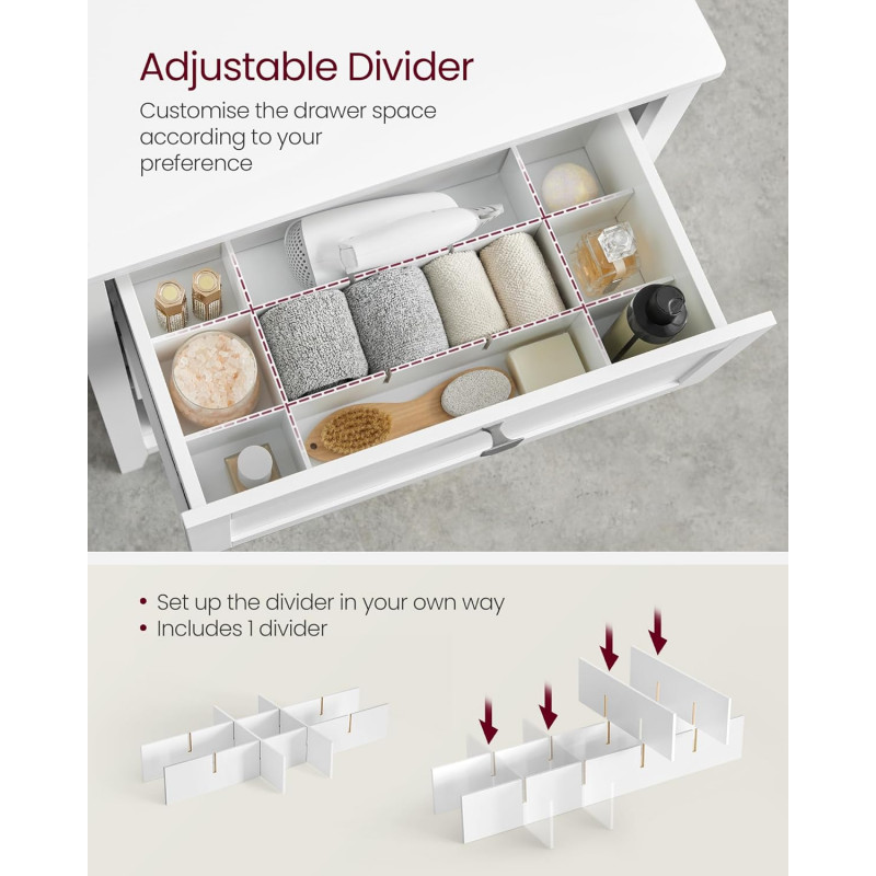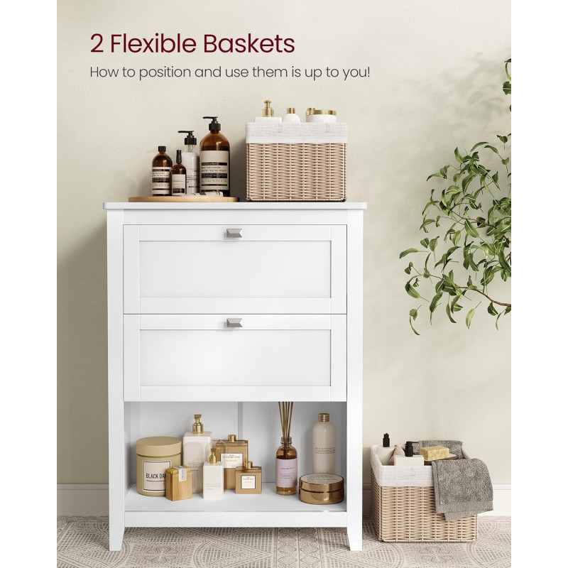 Scurta descriere: Dulapul de baie VASAGLE ofera solutii flexibile de depozitare intr-un format compact si elegant. Cele doua sertare spatioase, raftul interior si compartimentul deschis cu cosuri din ratan permit organizarea eficienta a produselor de baie. Designul alb cloud adauga un aspect luminos si aerisit incaperii.