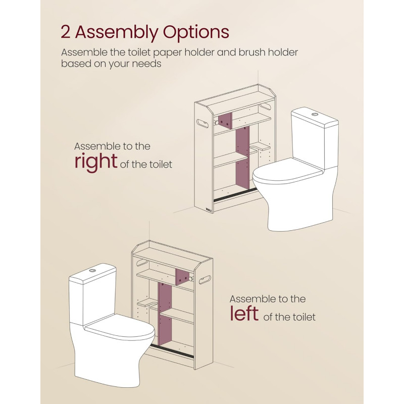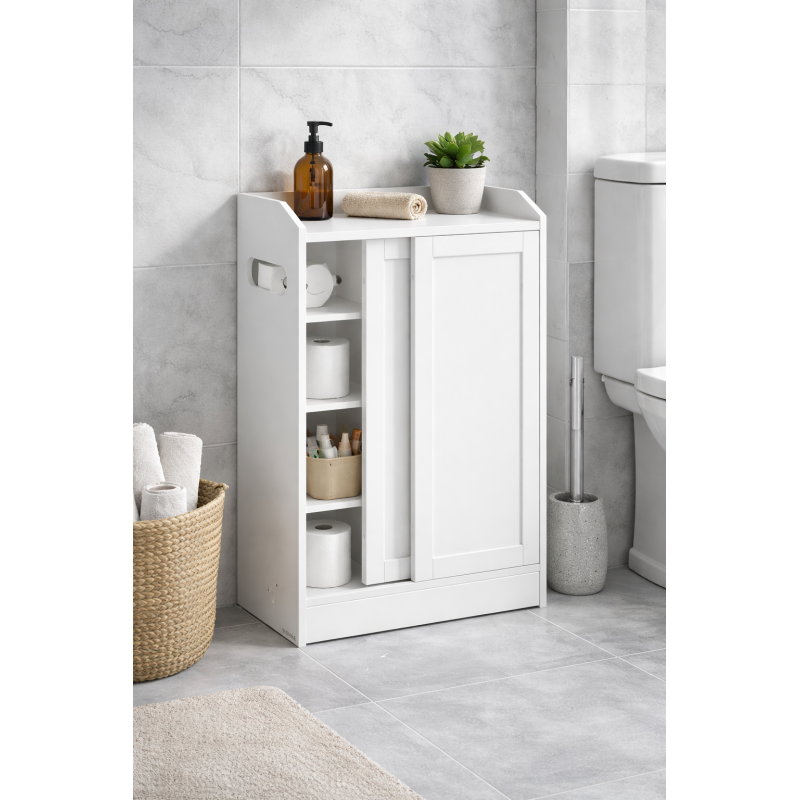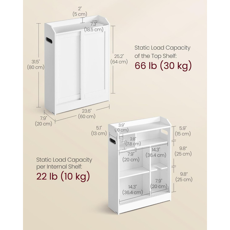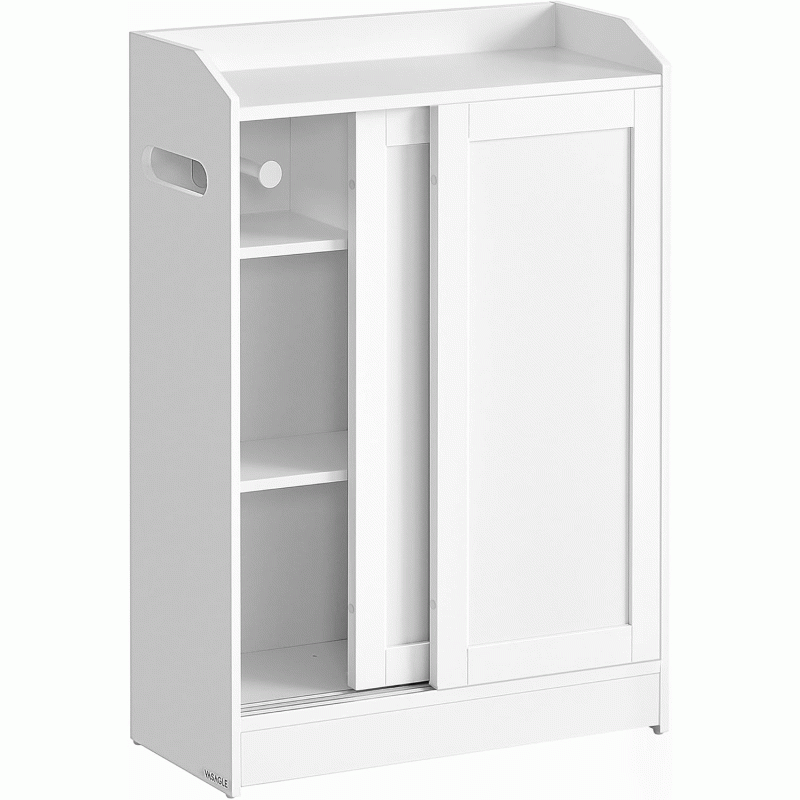 Scurta descriere: Dulapul de baie ingust VASAGLE este solutia practica pentru organizarea eficienta a spatiilor mici. Conceput special pentru a fi amplasat langa toaleta, acesta include compartimente dedicate pentru hartie igienica si peria WC, precum si rafturi reglabile pentru produse de diferite dimensiuni. Designul alb cloud completeaza armonios baile moderne.