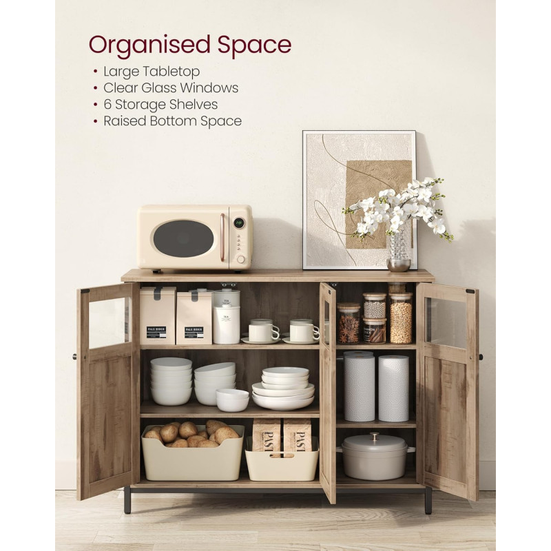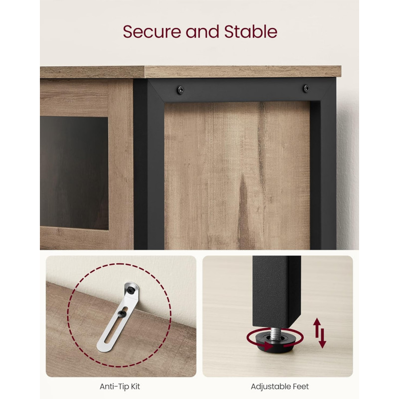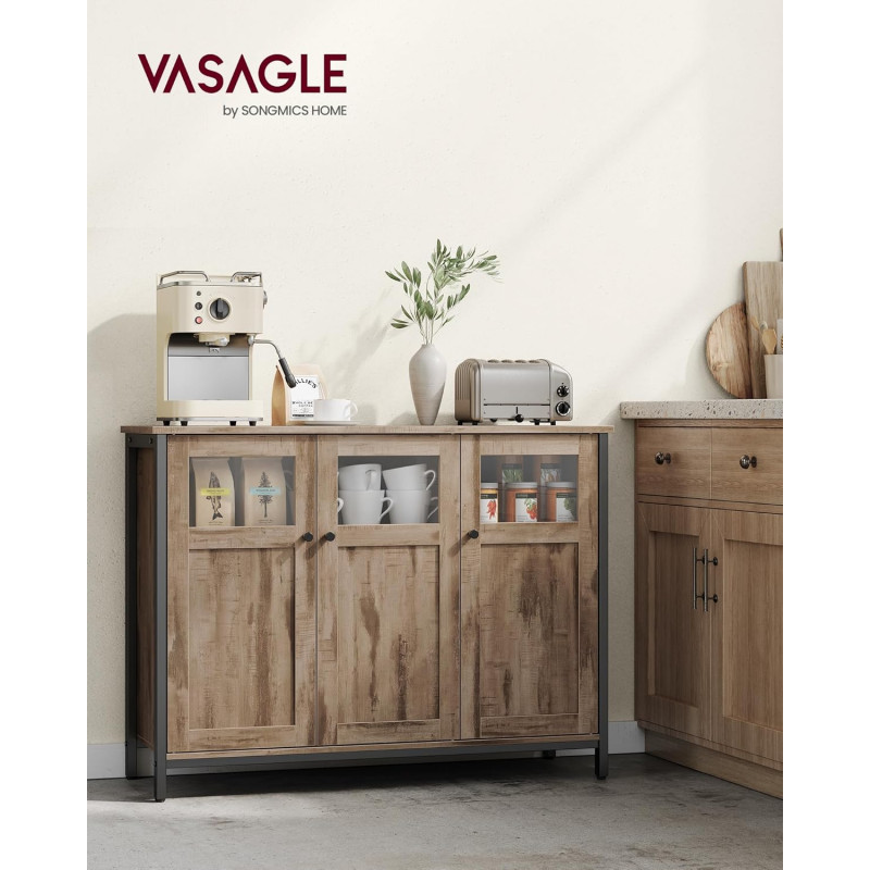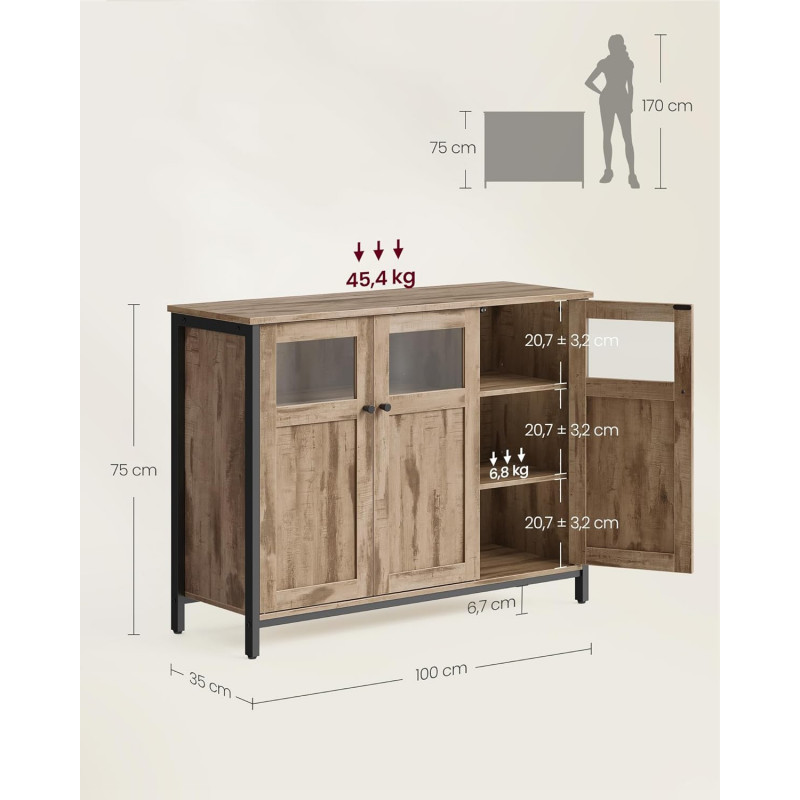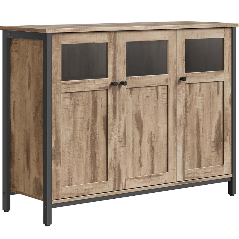 Scurta descriere: Acest dulap de bucatarie in stil industrial aduce un plus de caracter spatiului tau, combinand PAL maro camel cu un cadru metalic negru si usi din sticla partial transparente. Ideal pentru living, bucatarie sau dining, ofera spatiu generos si organizat pentru obiectele de uz zilnic.