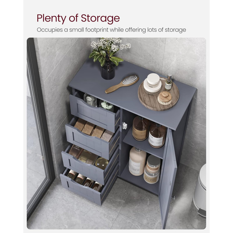Depozitare asortata: articole frecvent necesare pe blatul mesei, articole mici in cele 4 sertare si raftul reglabil pe 3 niveluri din spatele usii pentru articole de diferite dimensiuni. Astfel, veti avea o baie ordonata