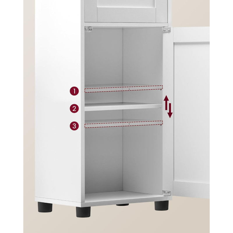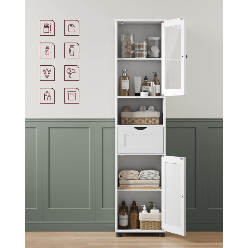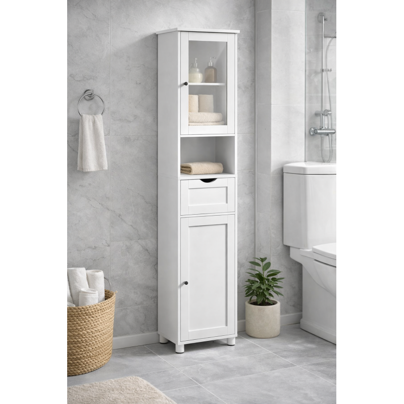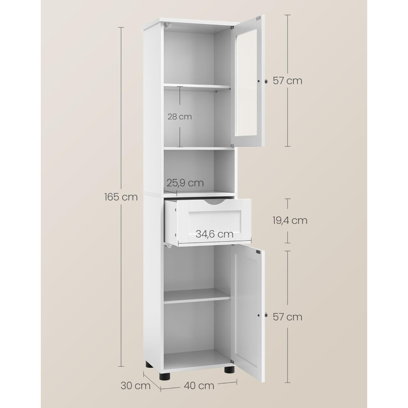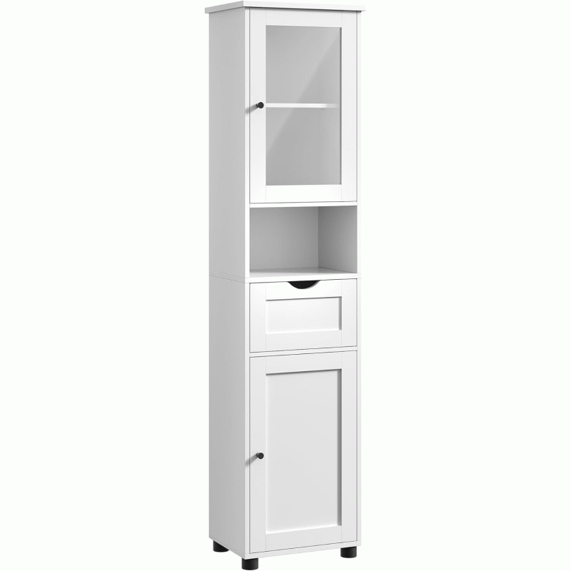 Scurta descriere: Dulapul de baie VASAGLE cu design inalt si ingust este solutia ideala pentru organizarea eficienta a spatiilor mici. Combinatia dintre raftul deschis, sertar si compartimentul cu usa din sticla permite depozitarea ordonata a prosoapelor, produselor de ingrijire si accesoriilor, aducand in acelasi timp un plus de eleganta baii.