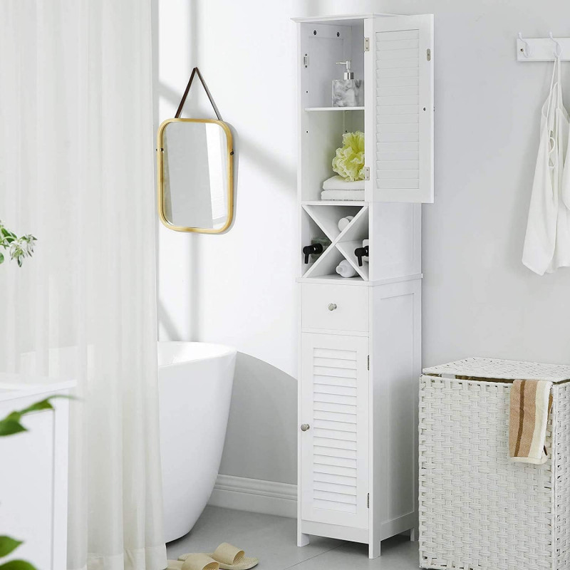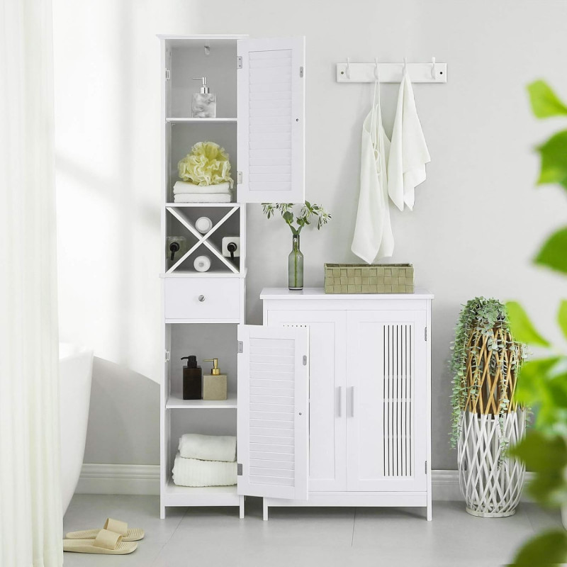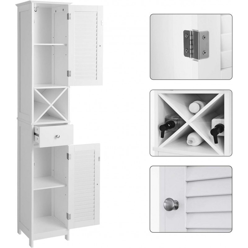 Capacitate de incarcare statica: 20 kg Despre acest articol Acest dulap de baie alb elegant este fabricat din lemn prelucrat de calitate. Usile cu obloane permit o buna ventilatie si va mentin produsele de ingrijire uscate pentru o utilizare mai placuta.Setati dulapul inalt in dreapta chiuvetei, astfel incat sa puteti deschide in mod convenabil usile pentru a va accesa produsele de toaleta si a va bucura de rutina zilnica de frumusete. Mai aveti cateva maruntisuri imprastiate prin jur? Organizati-le in sertar!Cu o amprenta mica de 32 x 30 cm, acest dulap de depozitare ocupa putin spatiu pe podea, facand in acelasi timp o mare diferenta pentru baia dvs. sau, daca doriti sa adaugati spatiu de depozitare suplimentar in camera de zi sau la intrare, acesta va fi perfect.Au disparut zilele in care va petreceti dupa-amiaza asambland mobila; cu