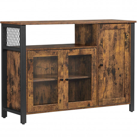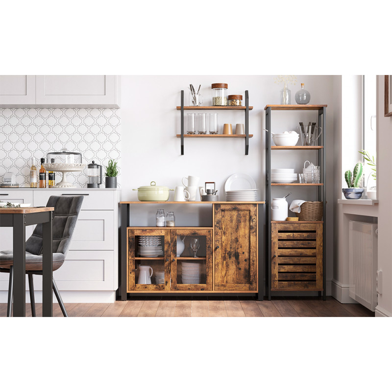 Capacitate de incarcare statica pe nivel de raft in zona inferioara: 10 kg. Despre acest articol Un dulap cu un finisaj de culoarea lemnului si un cadru metalic negru in stil industrial, toate decorate cu o usa cu lamele si cu doua usi transparente .Acest dulap are rafturi reglabile pentru carti de retete, 1 compartiment deschis pentru borcane si o suprafata mare, perfecta pentru organizarea viitoarelor dvs. bufete.Acest dulap de bucatarie nu-si va pierde echilibrul. Datorita picioarelor reglabile, acesta ramane constant stabil chiar si pe un teren usor denivelat.Datorita panourilor din placi aglomerate de calitate, sustinute de un cadru metalic solid, acest dulap va poate servi pe dvs. si pe prietenii dvs. cu zambete vesele multi ani de acum incolo.Acest dulap din colectia noastra este usor de asamblat. Pentru ca vine cu piese etichetate si
