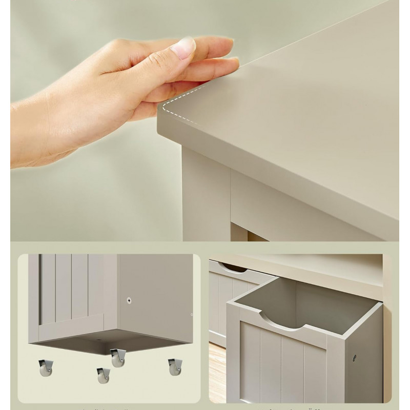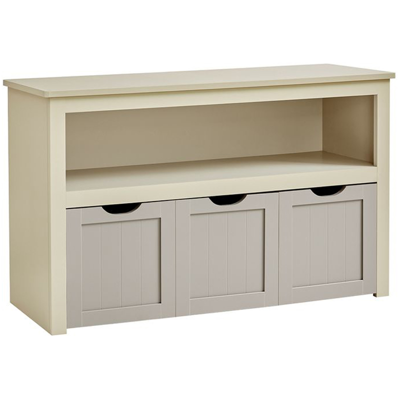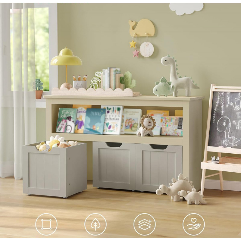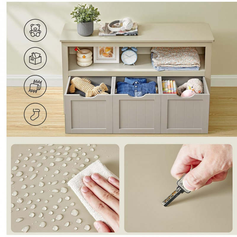 Design prietenos pentru copii: Copilul dvs. poate scoate cu usurinta cele 3 cutii - fiecare cu 4 roti - decupajele ajuta la evitarea ciupirii mainilor; raftul pentru copii are 60 cm inaltime si copilul dvs. poate ajunge cu usurinta la jucariile lor.