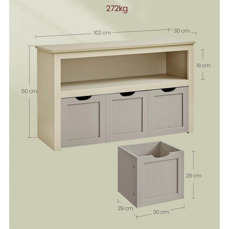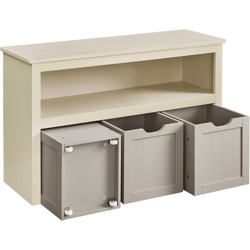 Design inteligent: O zona de depozitare in partea de sus, un compartiment deschis, 3 cutii (29 x 30 x 28 cm) in partea de jos. Acest dulap pentru jucarii ofera suficient spatiu pentru toate: mingi, papusi, blocuri de constructie si carti cu imagini pot fi frumos sortate si depozitate convenabil.