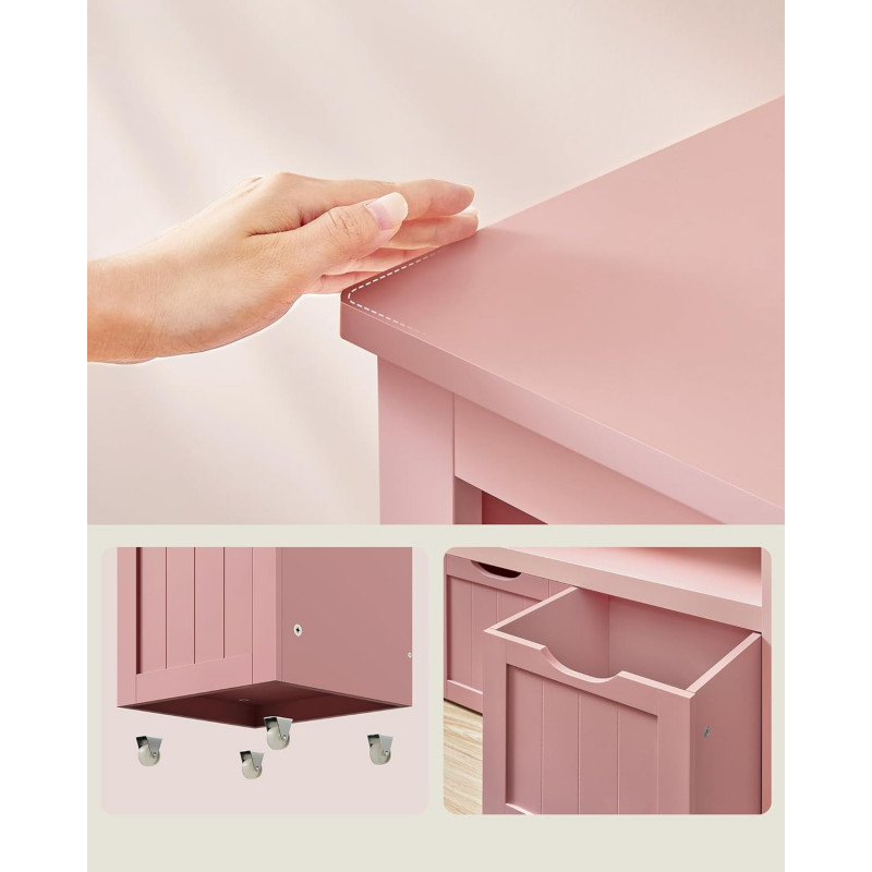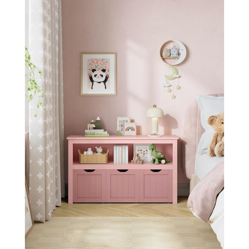 Design prietenos pentru copii: Copilul dvs. poate scoate cu usurinta cele 3 cutii - fiecare cu 4 roti - decupajele ajuta la evitarea ciupirii mainilor; raftul pentru copii are 60 cm inaltime si copilul dvs. poate ajunge cu usurinta la jucariile lor.