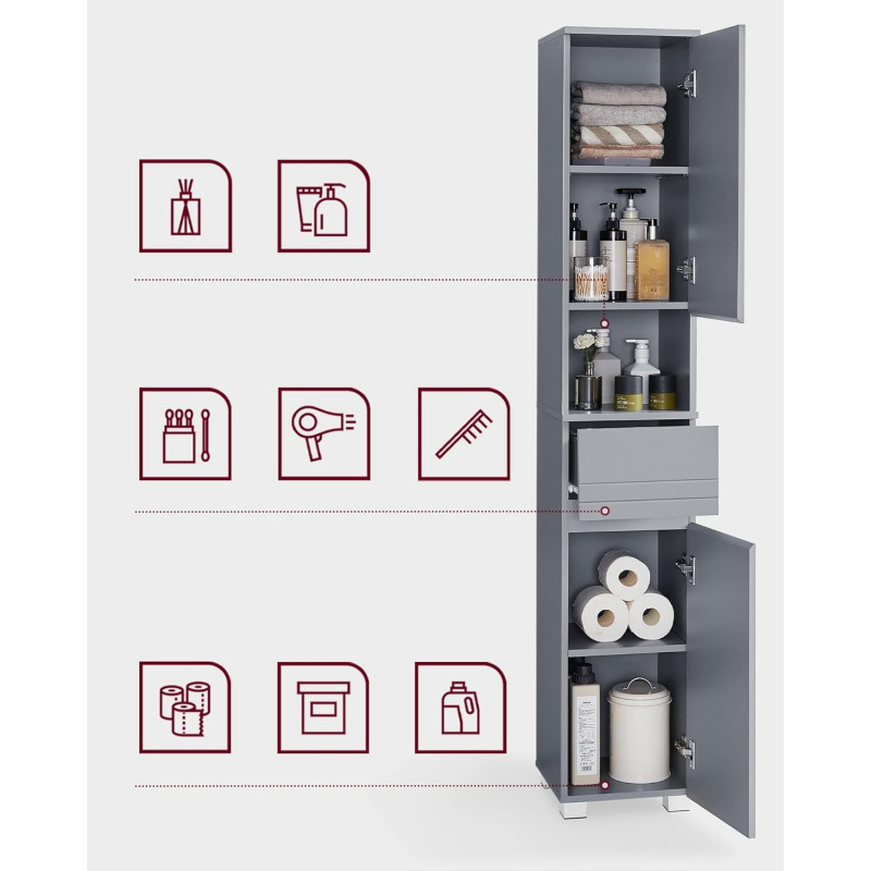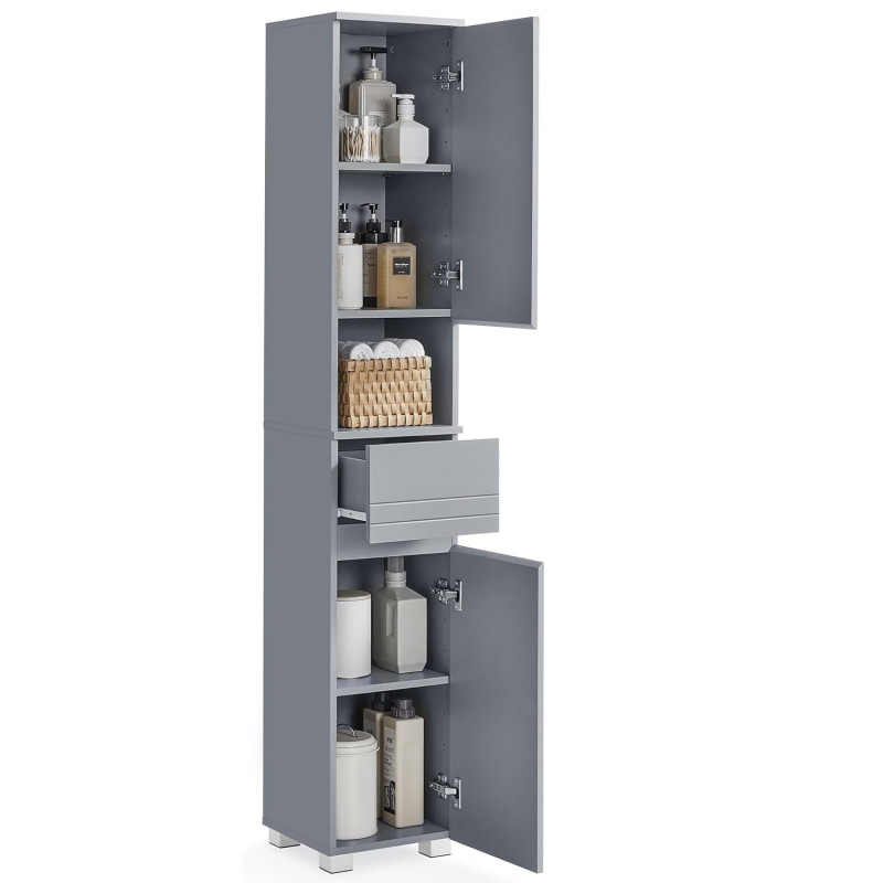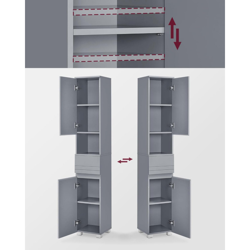 Scurta descriere Acest dulap inalt si ingust este solutia ideala pentru depozitare eficienta in spatii reduse. Cu sertar, rafturi reglabile si usi reversibile, ofera flexibilitate si organizare pentru baie sau hol. Fabricat din MDF rezistent si echipat cu sistem anti-rasturnare, asigura siguranta si stabilitate in utilizare.