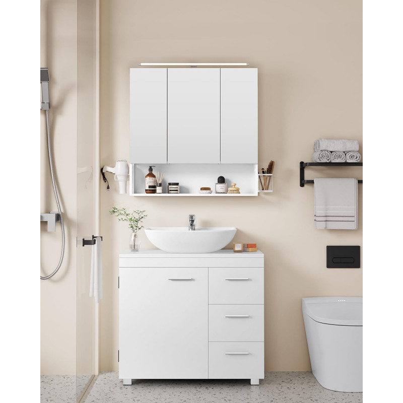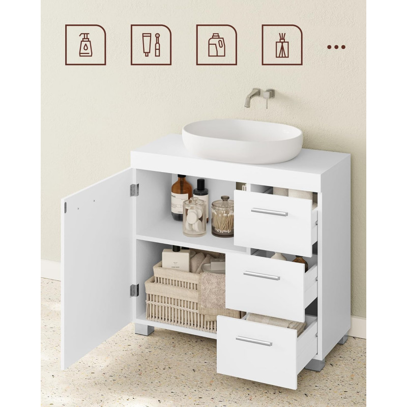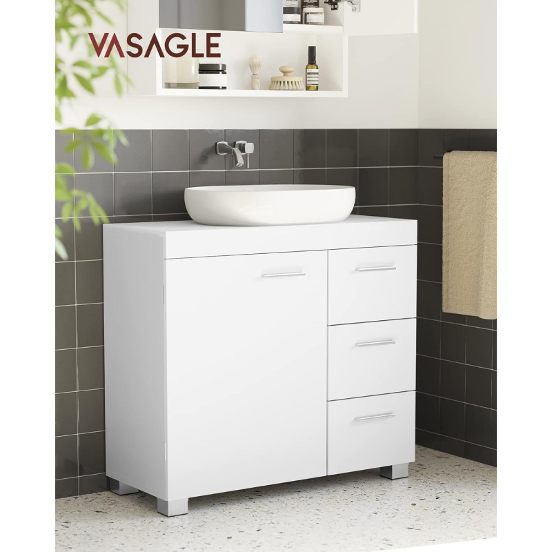 Scurta descriere Acest dulap de baie VASAGLE este proiectat special pentru a se potrivi sub lavoare cu sau fara coloana. Cu 3 sertare laterale si 2 compartimente spatioase in spatele unei usi, ofera solutii eficiente pentru depozitarea prosoapelor, detergentilor si accesoriilor de baie. Raftul interior ajustabil in 3 pozitii permite organizarea sticlelor de diverse dimensiuni, iar constructia robusta din MDF este rezistenta si usor de curatat.