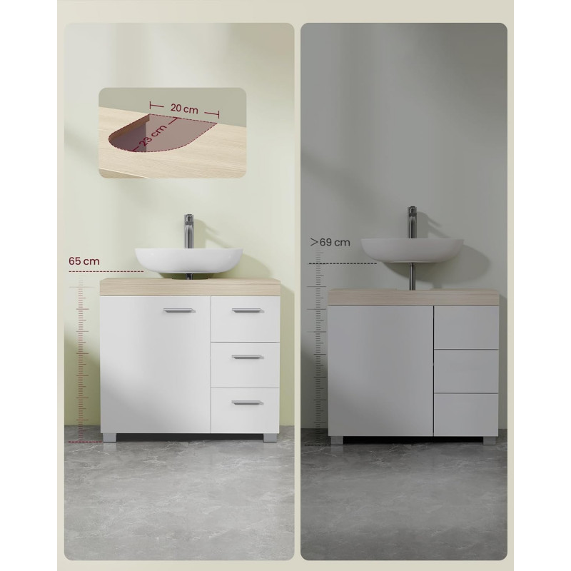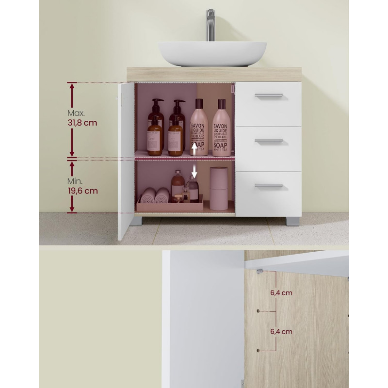 Scurta descriere Dulapul de baie VASAGLE este conceput pentru a valorifica eficient spatiul de sub lavoar. Ofera 3 sertare mari pentru organizare detaliata si un dulap cu raft reglabil pentru produse voluminoase. Designul in nuante alb cloud si bej natural adauga luminozitate si echilibru baii.
