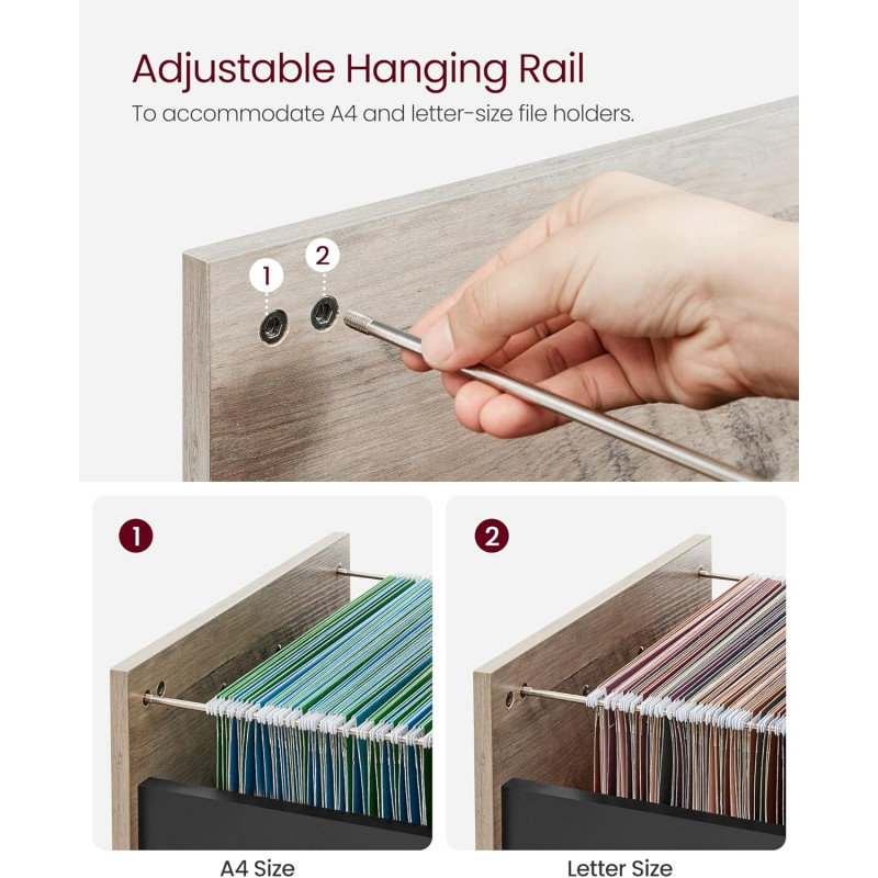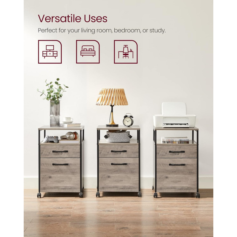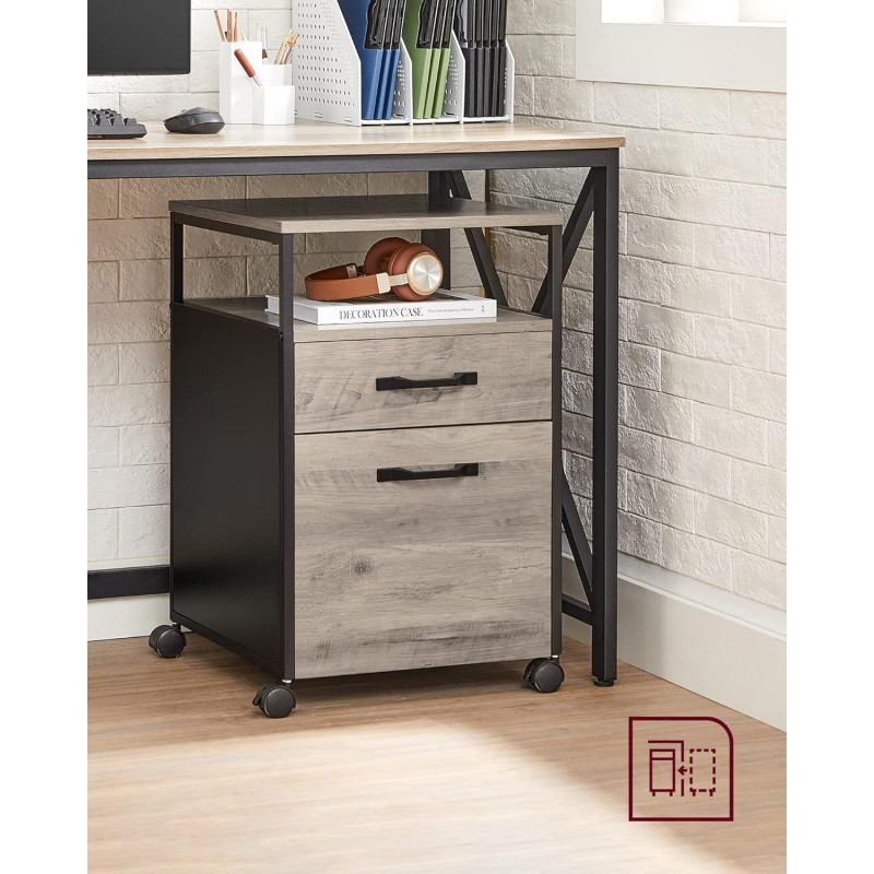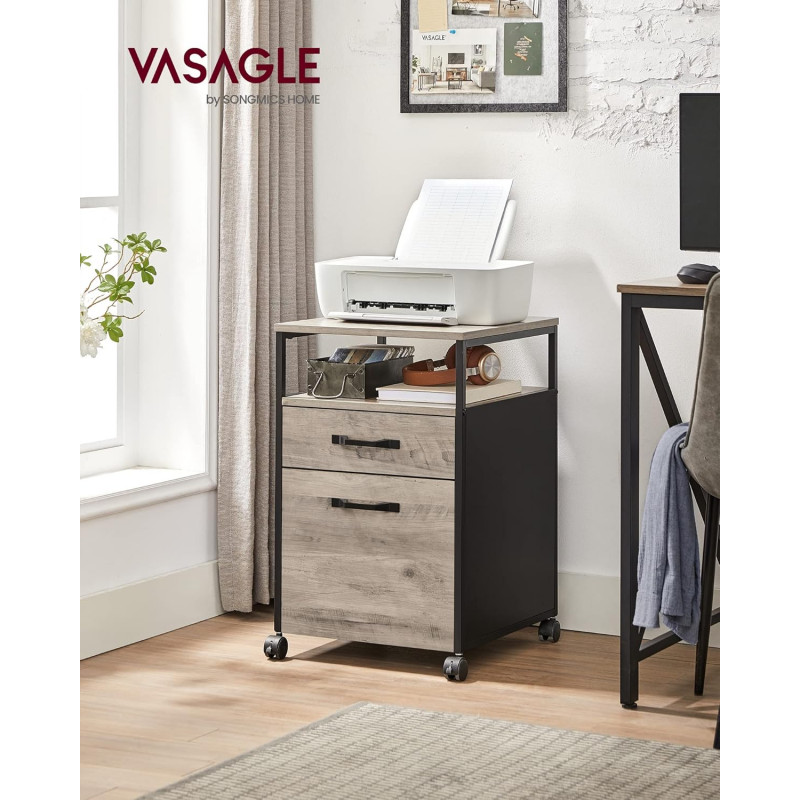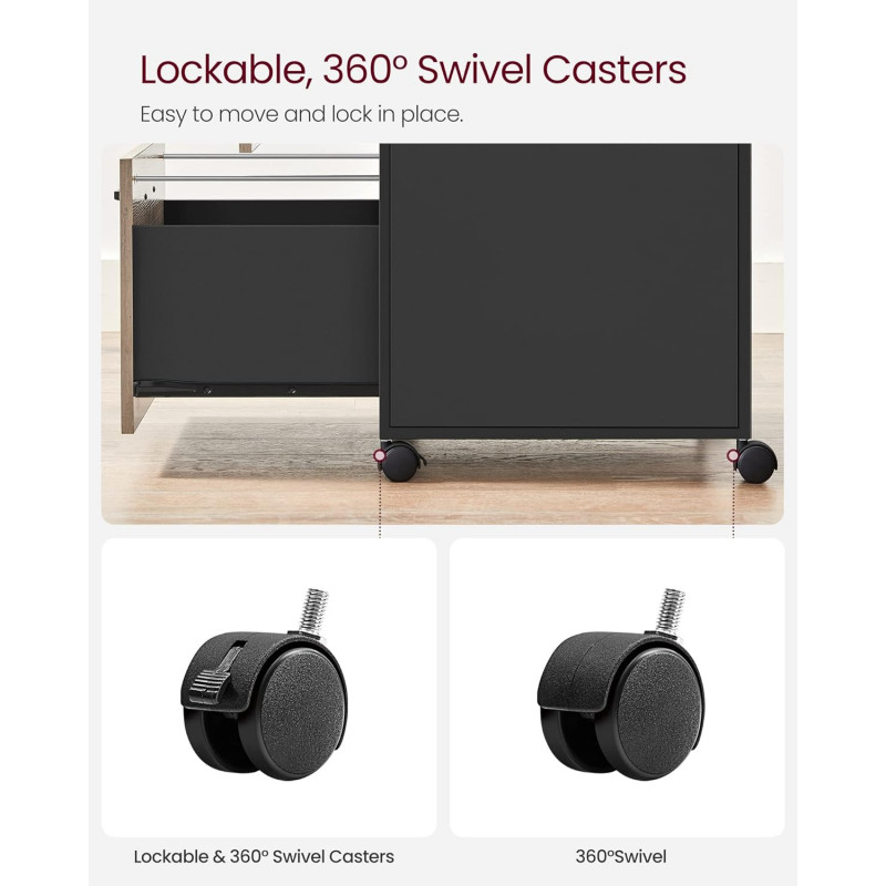 Scurta descriere: Organizeaza-ti eficient spatiul de lucru cu acest dulap mobil VASAGLE in stil industrial. Ofera un raft superior pentru decor sau accesorii, un compartiment deschis, un sertar pentru articole mici si un sertar mare cu bara ajustabila pentru dosare suspendate A4 sau letter. Structura din otel si PAL de calitate asigura rezistenta, iar rotile pivotante cu frana ofera mobilitate si stabilitate.