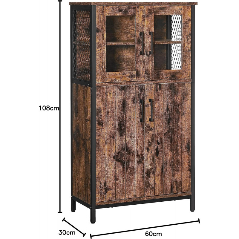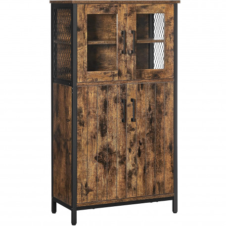 Capacitate de incarcare statica a fiecarui raft interior: 5 kg Despre acest articol Amestecul il face diferit! Metal, sticla, maro rustic, negru, usi cu lamele, design cu grila... aceste elemente sunt combinate inteligent pe acest dulap; puteti sa il puneti in camera de zi, baie sau bucatarie pentru a adauga o nota unica.Panourile din placi aglomerate de calitate sunt puternice, ce se intampla cand sunt intarite de structura solida din otel? Acestea creeaza acest dulap stabil, capabil sa sustina pana la 30 kg pe suprafata superioara si gata sa va serveasca pentru anii urmatori.Acest dulap este exact ceea ce va trebuie, cu un blat mare pentru a va expune decoratiunile preferate, usi de sticla pentru a va spune ce se afla pe cele 2 rafturi si un raft reglabil in dulap, care permite pastrarea obiectelor mici si mari.Echipat cu picioare reglabile, acest dulap multifunctional ramane mereu stabil.Ce primiti: Un dulap de depozitare in stil industrial, cu fiecare piesa numerotata si