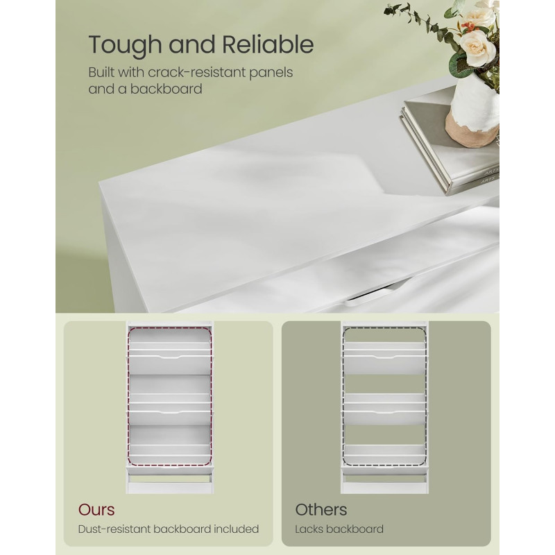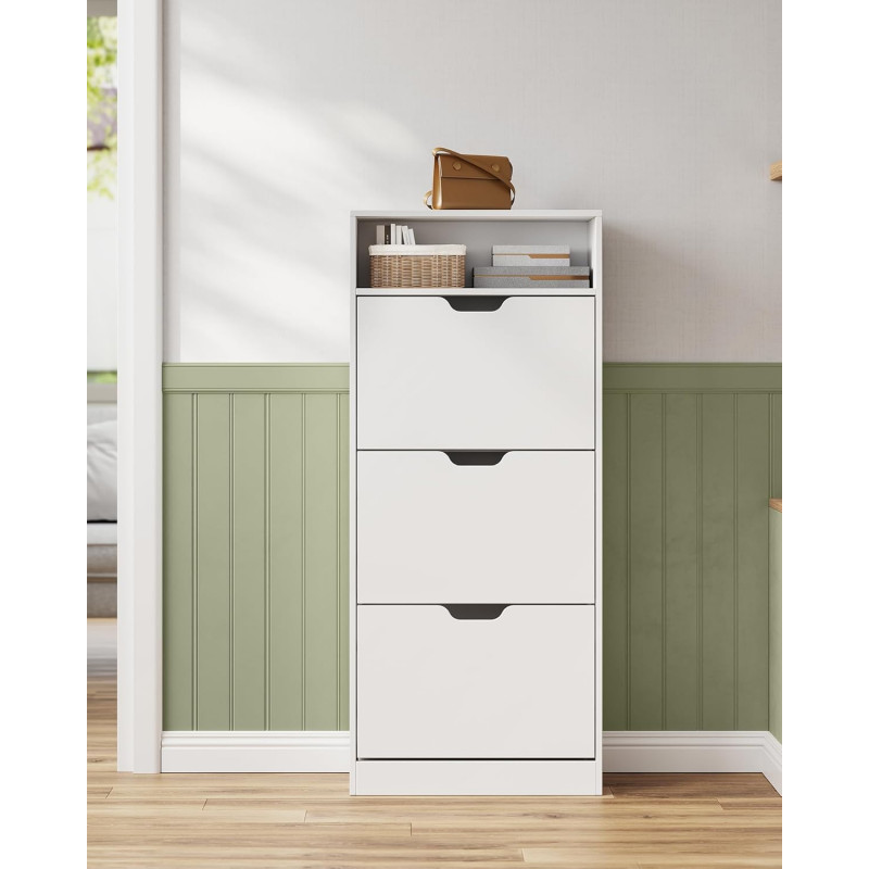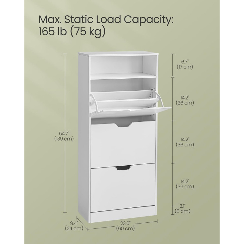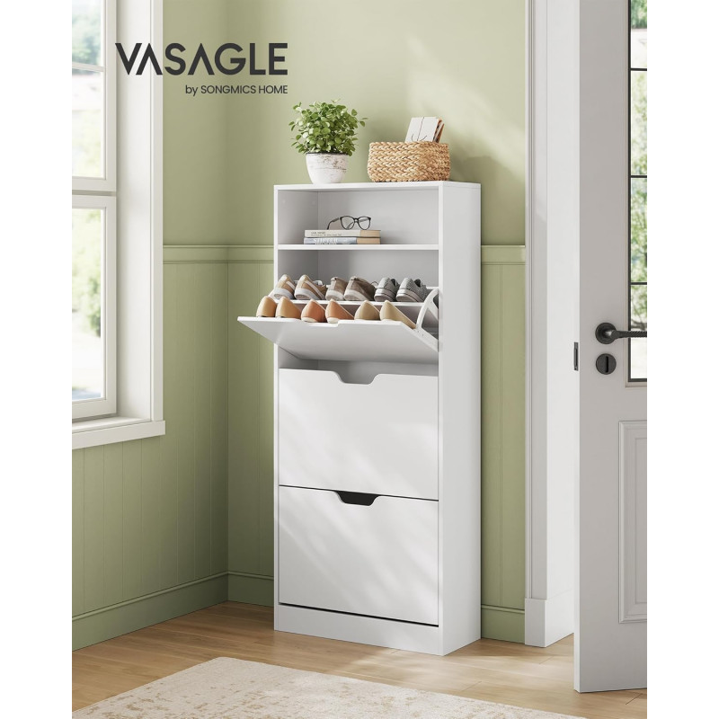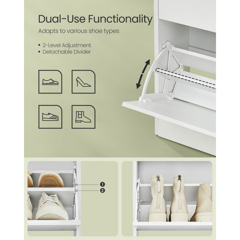 Instructiuni Note VASAGLE: Va rugam sa fixati acest dulap pentru incaltaminte la perete cu kitul anti-basculare furnizat. Spatiosul intalneste versatilitatea Dulapul pentru pantofi are spatiu pentru 14-18 perechi de pantofi! In plus, cu spatiile de depozitare deschise, aveti un blat pentru decoruri, fotografii sau suveniruri, facand ca spatiul dvs. sa fie nu doar organizat, ci si aspectuos Adaptabil si eficient din punct de vedere al spatiului Cu separatoare detasabile si 3 niveluri reglabile per separator, acest dulap pentru pantofi se adapteaza nevoilor tale, potrivindu-se diferitelor tale tipuri de pantofi. Ajusteaza-l, intoarce-l si optimizeaza-ti spatiul, in felul tau Incredere in durabilitate Fabricat din panouri de inalta calitate, rezistente la fisuri, si echipat cu o placa de protectie pentru praf si insecte, acest dulap subtire de depozitare a pantofilor este un refugiu sigur pentru incaltamintea dvs. Elegant si sofisticat Dulapul pentru pantofi pentru holuri, cu designul sau aerodinamic si estetica sa minimalista, merge dincolo de simpla functionalitate. Este o piesa care infrumuseteaza decorul casei dvs Asamblare fara efort Am facut ca asamblarea sa fie floare la ureche cu