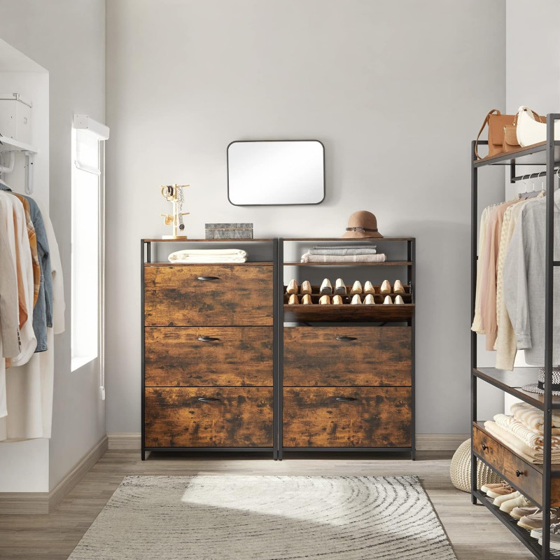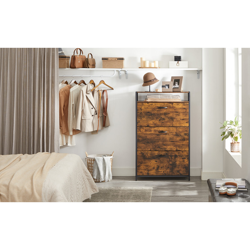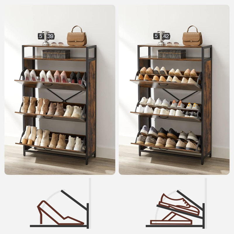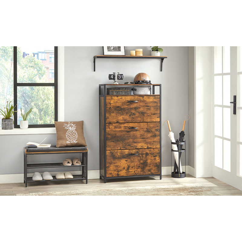 Capacitatea de incarcare statica pe compartiment: 5 kg Despre acest articol Depozitati-va pantofii in acest dulap elegant pentru pantofi. Cand veniti acasa, pur si simplu deschideti usa pentru a va introduce pantofii. Oferiti holului dvs. un aspect nou.Acest dulap pentru pantofi, cu dimensiunea sa subtire de 80 x 30 x 130 cm si 3 compartimente cu separatoare interne, reglabile pe inaltime, poate stoca pana la 15-24 perechi de pantofi, in timp ce ocupa putin spatiu pe podea. Raftul deschis poate gazdui portofele, ochelari de soare si alte lucruri esentiale.Stilul nu ar trebui sa fie pierdut atunci cand vine vorba de raftul tau pentru pantofi. Amestecul de placi aglomerate rustice maro si otel negru emana un aer industrial elegant pentru a va impresiona oaspetii.Datorita pieselor numerotate incluse si a