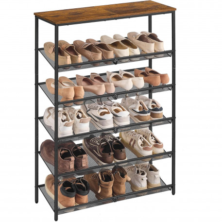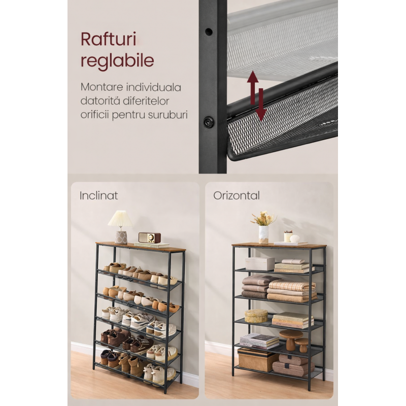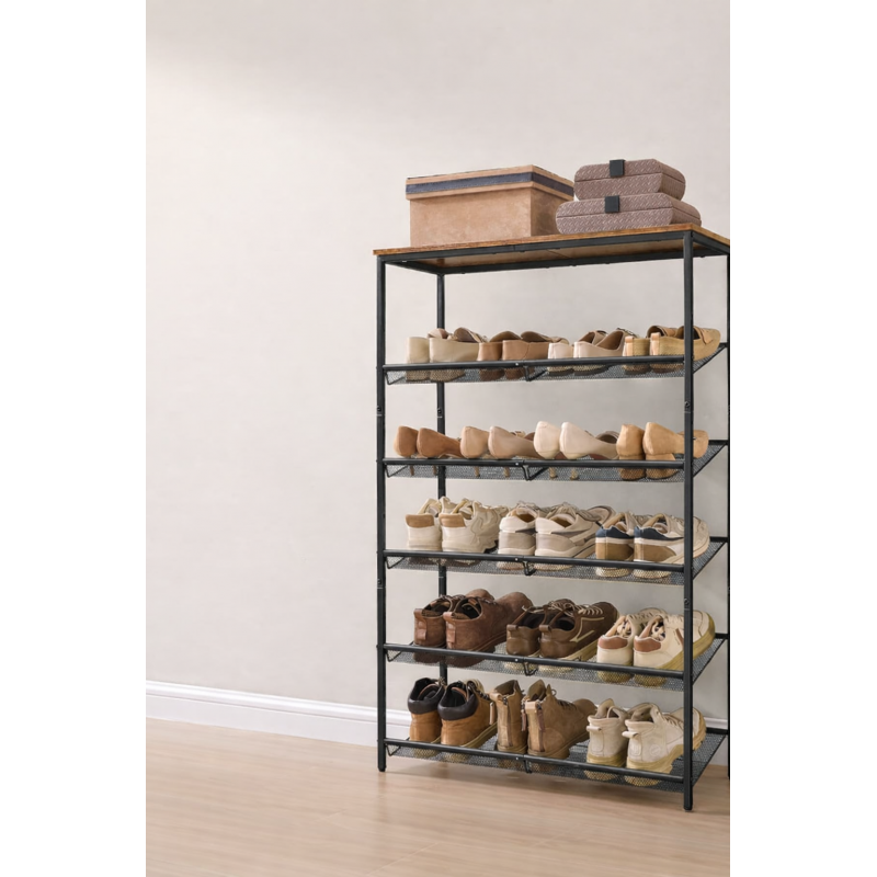 Scurta descriere: Etajera pentru pantofi cu 6 niveluri, ideala pentru hol sau dressing. Ofera spatiu pentru aproximativ 15–20 perechi de pantofi si permite depozitarea inclusiv a ghetelor sau pantofilor cu toc. Design industrial, stabil si usor de integrat in orice interior.