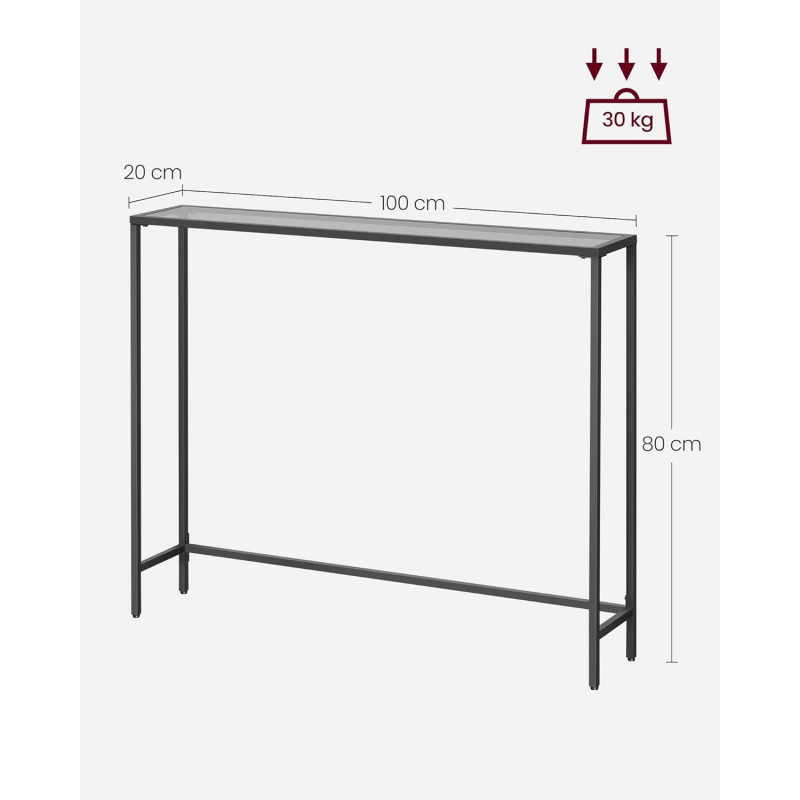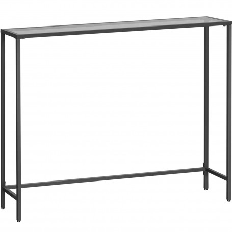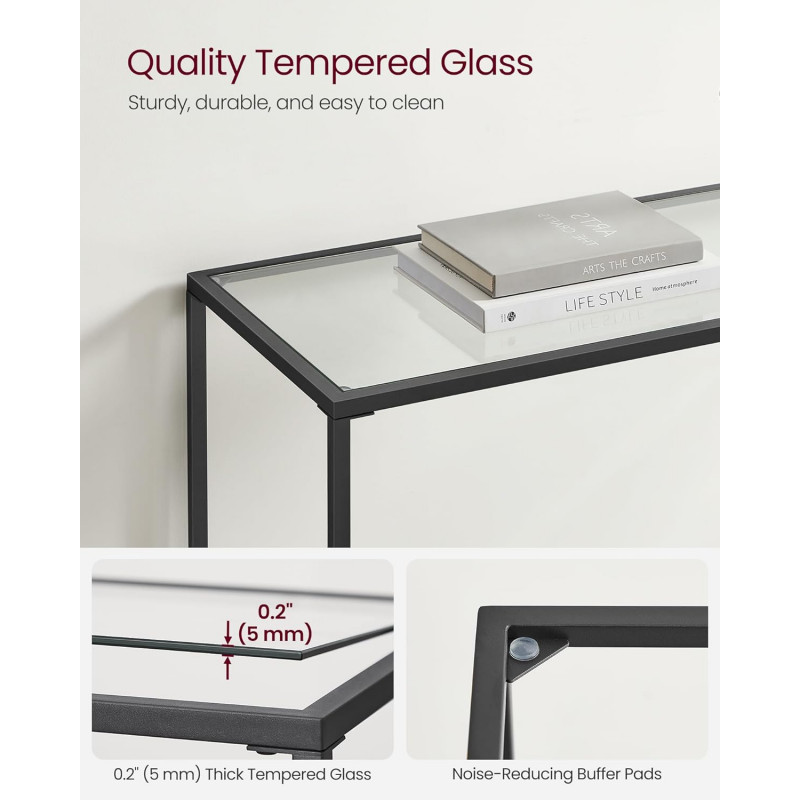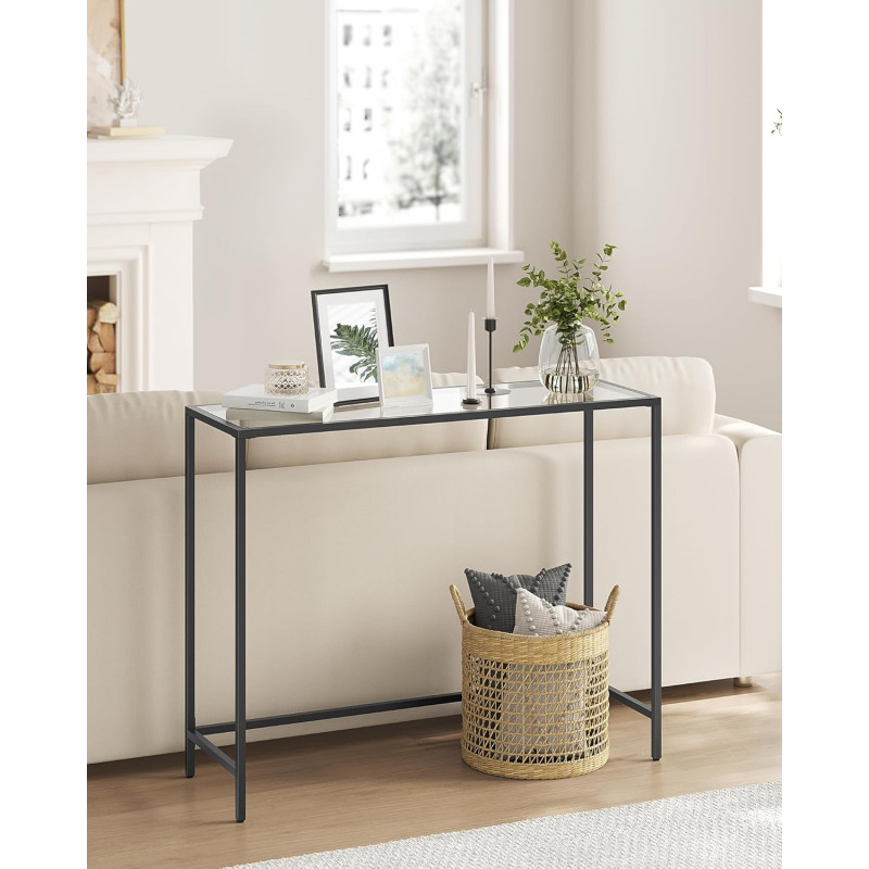 Scurta descriere: Aceasta masa consola VASAGLE imbina eleganta minimalismului cu functionalitatea moderna. Blatul din sticla securizata si cadrul metalic solid creeaza o piesa de mobilier ideala pentru hol, living sau chiar bucatarie. Cu un design aerisit si dimensiuni compacte, este perfecta pentru expunerea obiectelor decorative, plantelor sau cartilor. Picioarele reglabile asigura stabilitate pe orice suprafata.