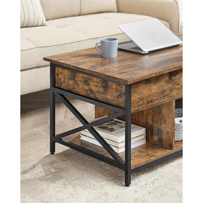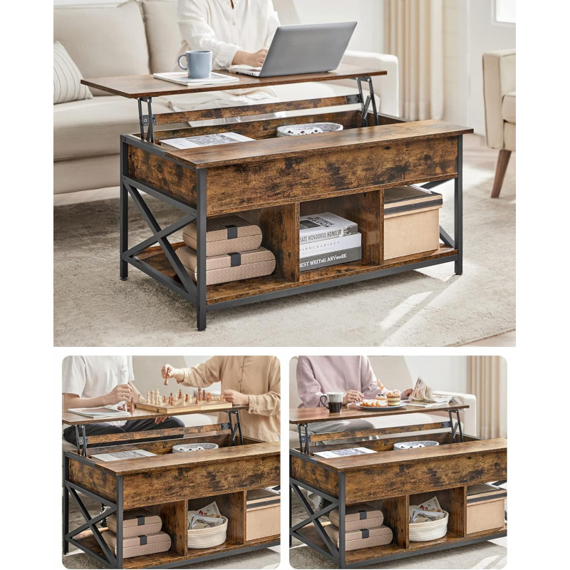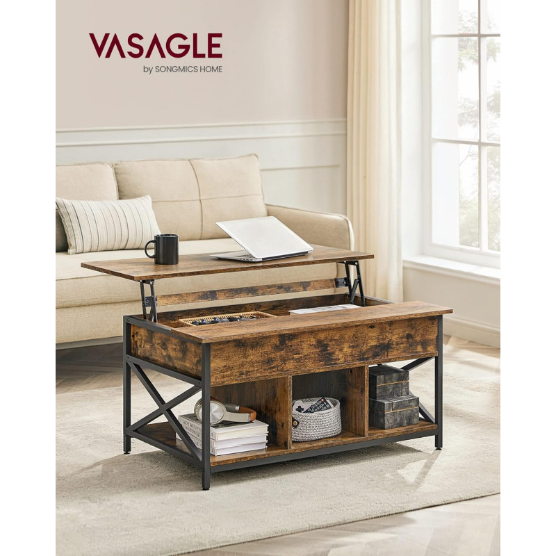 Scurta descriere Masuta de cafea VASAGLE combina designul industrial cu functionalitatea moderna. Blatul ridicabil iti permite sa lucrezi, sa mananci sau sa te relaxezi confortabil direct de pe canapea, iar compartimentarea inteligenta ofera atat spatiu deschis, cat si ascuns pentru organizare eficienta.