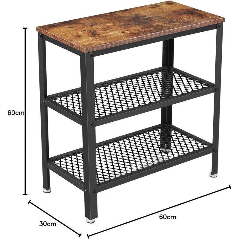 Material: Lemn prelucrat, metal Despre acest articol Subtire, simpla si totusi un mic punct de atractie - aceasta masuta laterala de 60 x 30 x 60 cm se potriveste cu gratie in orice spatiu din casa dvs. pe care doriti sa il infrumusetati cu o nota de farmec industrial.O suprafata maro rustic si 2 nivele solide - aceasta masa decorativa ofera 3 rafturi diferite pentru carti, accesorii TV, paharele dvs. sau plante.Datorita dimensiunilor sale subtiri, poate fi pozitionata ideal si langa canapeaua dvs., intr-un hol mic sau in bucatarie Datorita numarului gestionabil de piese individuale si a