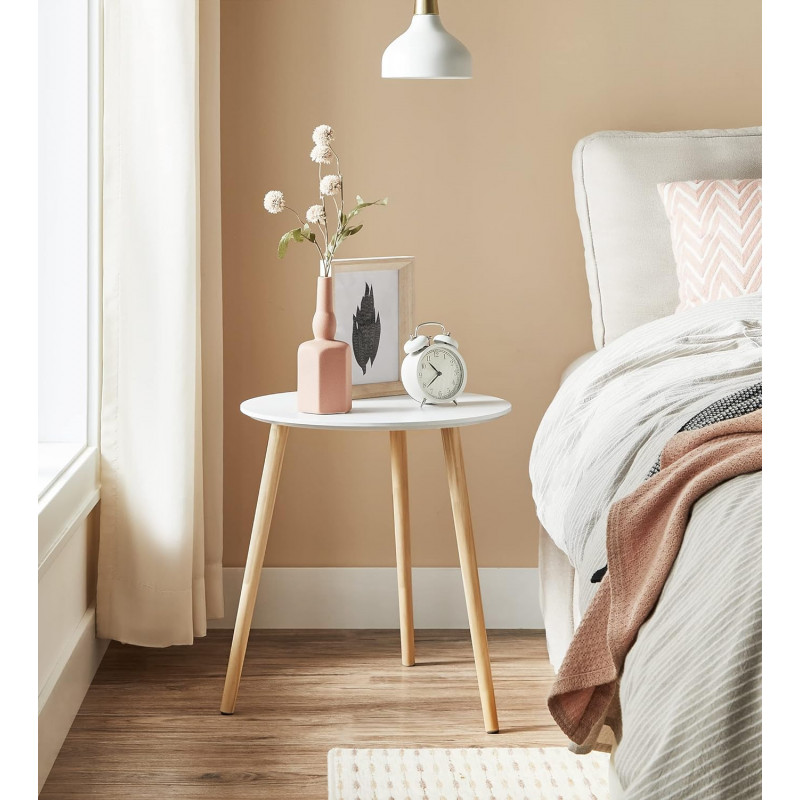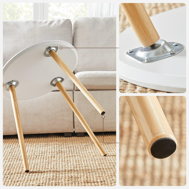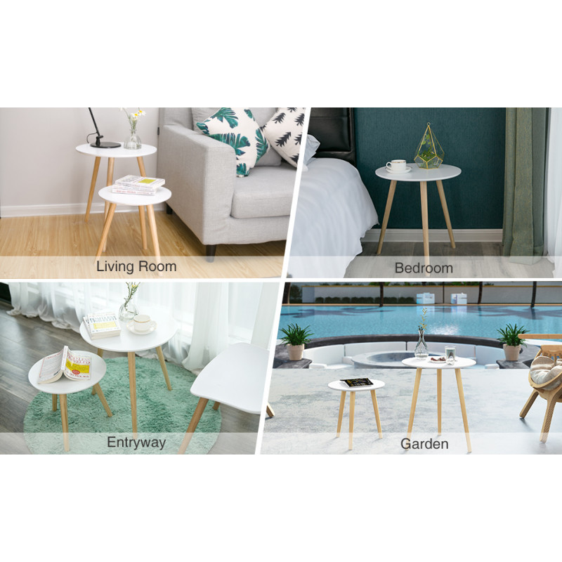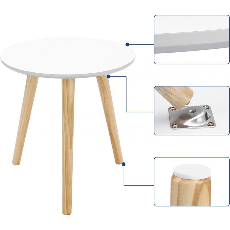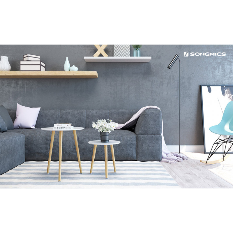 Dimensiunile mesei mari: diametru 45 cm, inaltime 50 cm; dimensiunile mesei mici: diametru 35 cm, inaltime 35 cm, mesele pot fi folosite ca masuta de cafea, masuta laterala, taburet pentru plante etc, singure sau intr-un set.Solida si durabila - Blatul realizat din panouri MDF ecologice de inalta calitate, trepiedul solid cu 3 picioare din lemn masiv de pin asigura o buna stabilitate si o durata de viata lunga.Usor de asamblat si usor de curatat - La asamblare, trebuie doar sa insurubati picioarele mesei pe blatul mesei, fara alte unelte; masa poate fi curatata cu usurinta cu o carpa moale.