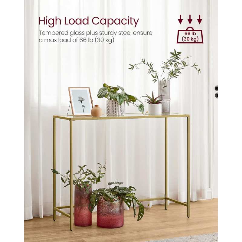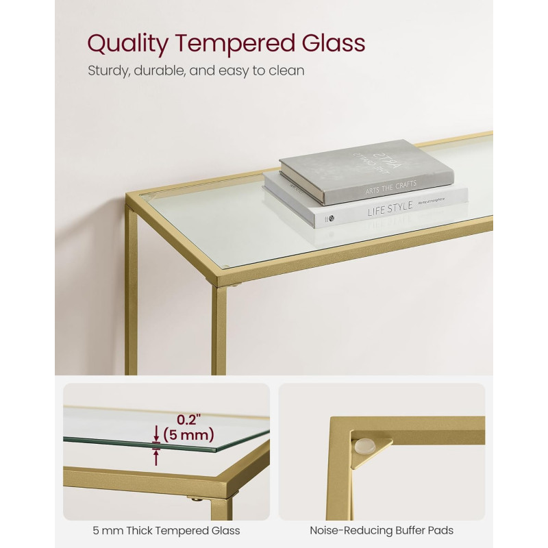 Minimalism uluitor: Du-ti casa la urmatorul nivel cu o masa consola moderna care uneste otel elegant, de culoare aurie si un blat din sticla calita intr-o singura piesa minimalista, dar functionala.Suport puternic: Sticla securizata cu grosimea de 5 mm se afla amplasata deasupra cadrului de otel al acestei mese consola de 35 x 100 x 80 cm (L x l x H), oferind suport robust pentru pana la 30 kg de plante, decoratiuni, carti sau pretuite. mosteniri de familie.Foloseste-ti modul: Imaginati-va aceasta masa moderna din sticla calita in casa dvs. – unde este? In sufragerie ca o canapea? Langa usa ca o masa de intrare? Sau pe hol ca o masa de consola? Depinde de tine.Facut intr-o scurta plimbare: Nu este nevoie sa va luati o dupa-amiaza libera de la serviciu pentru a asambla aceasta masa de canapea robusta (atat de mult pe cat doriti!); cu