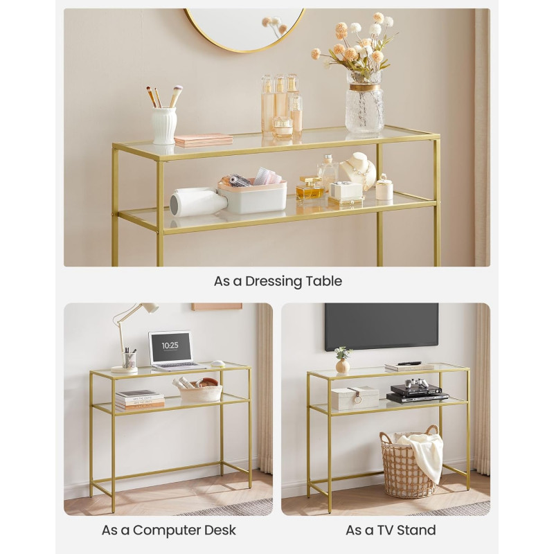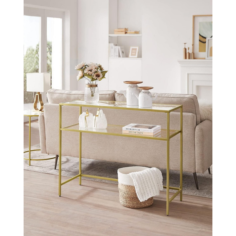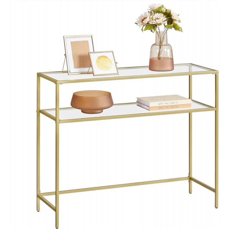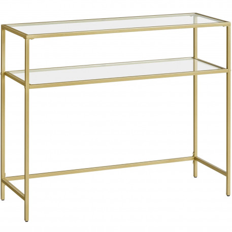 Sarcina statica a fiecarui raft: 20 kg Despre acest articol Duceti-va casa la un alt nivel cu o masa consola moderna care combina otelul metalic auriu si un blat din sticla calita intr-o singura piesa minimalista, dar functionala. Fie ca este la intrare, in spatele canapelei, in dormitor sau ascunsa sub scari, aceasta masa din sticla aduce un strop de eleganta si se potriveste perfect datorita designului sau simplu. Fiecare raft din sticla calita cu grosimea de 5 mm este asezat in varful cadrului din otel al acestei mese consola de 35 x 100 x 80 cm (D x L x H), oferind un suport solid pentru o greutate de pana la 30 kg.Instructiunile ilustrate si piesele numerotate va permit sa finalizati asamblarea acestei mese tip consola fara efort.