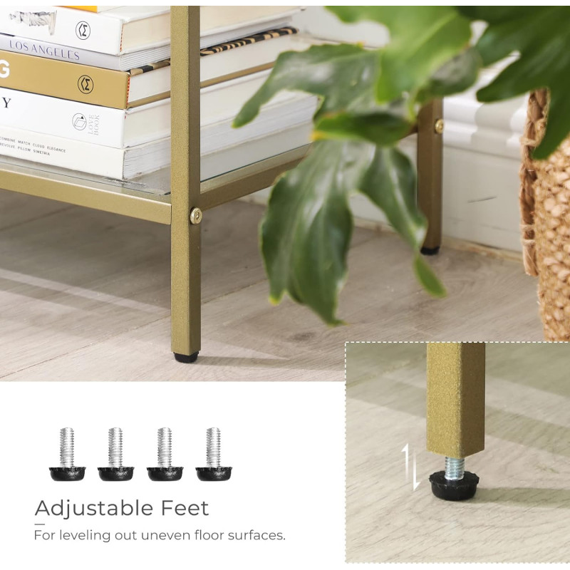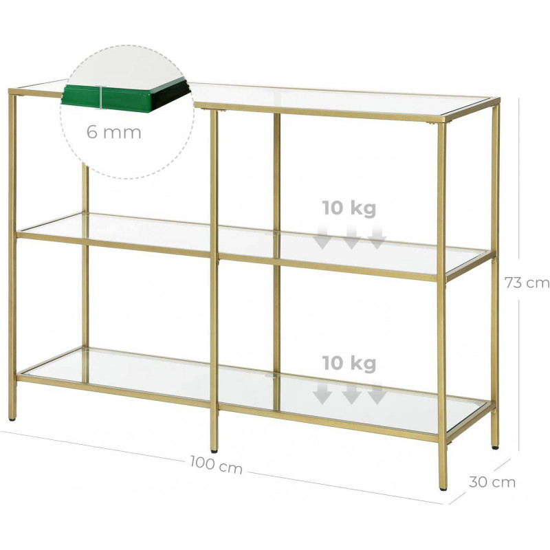 Produs pentru autoasamblare Despre acest articol Cadrul din metal auriu si suprafata din sticla calita creeaza o piesa de mobilier minimalista si eleganta, dar suficient de durabila pentru a va pastra toate comorile si amintirile. Blatul din sticla cu grosimea de 6 mm este fixat in siguranta pe cadrul metalic stabil al acestei console mari, care poate sustine pana la 30 kg. Cu 4 picioare reglabile pentru stabilitate, un kit anti-inclinare pentru o siguranta sporita si tampoane pentru reducerea zgomotului, masa noastra de consola este stabila, sigura si silentioasa.Instructiunile ilustrate si piesele numerotate va permit sa finalizati asamblarea acestei mese consola fara efort.