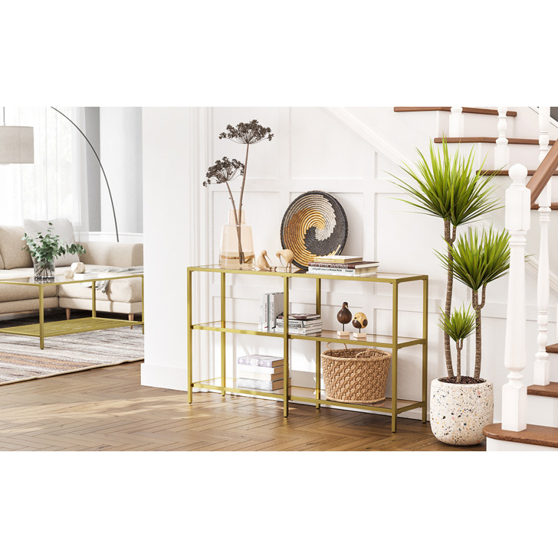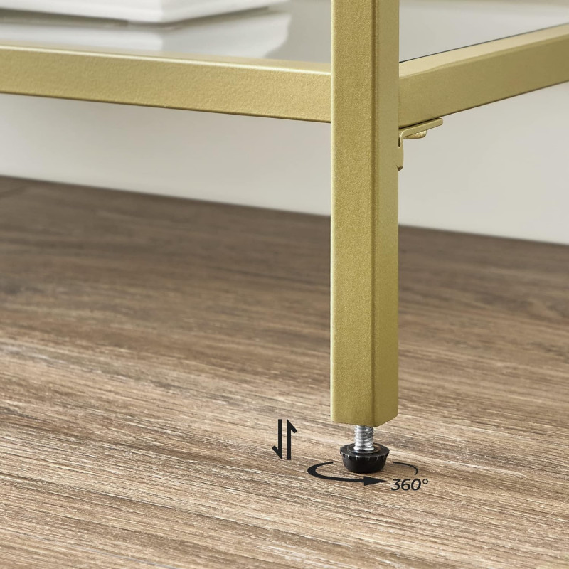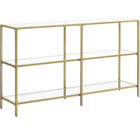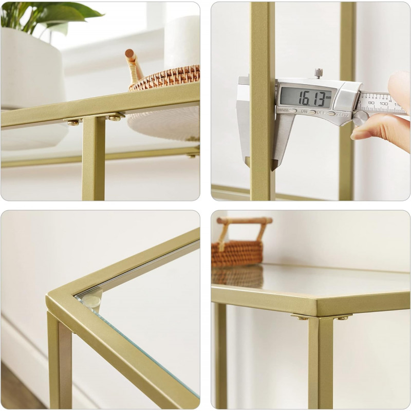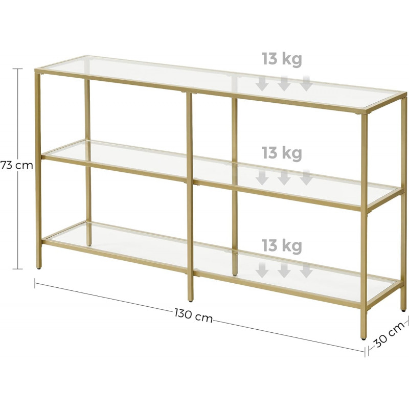 Capacitate de incarcare statica: 40 kg Despre acest articol Masa noastra tip consola, cu rafturile sale din sticla calita transparenta si rama aurie metalica, iti permite sa iti expui cu stil plantele, cartile si obiectele de colectie.Fie ca este la intrare, in spatele canapelei, in dormitor sau ascunsa sub scari, aceasta masa din sticla de 130 x 30 x 73.3 cm aduce un strop de eleganta si se potriveste perfect datorita designului sau simplu.Aceasta masa de intrare este construita pentru a fi de lunga durata. Cu sticla calita de 6 mm grosime si otel solid, poate sustine pana la 40 kg. Iar cand vine vorba de curatare, doar o stergere rapida si ati terminat!Cu 4 picioare reglabile pentru stabilitate, un kit anti-inclinare pentru o siguranta sporita si tampoane pentru reducerea zgomotului, masa noastra este stabila, sigura si silentioasa.Instructiunile ilustrate si piesele numerotate va permit sa finalizati asamblarea acestei mese tip consola fara efort.