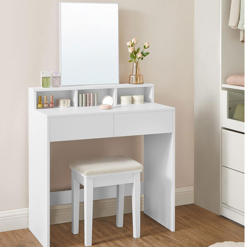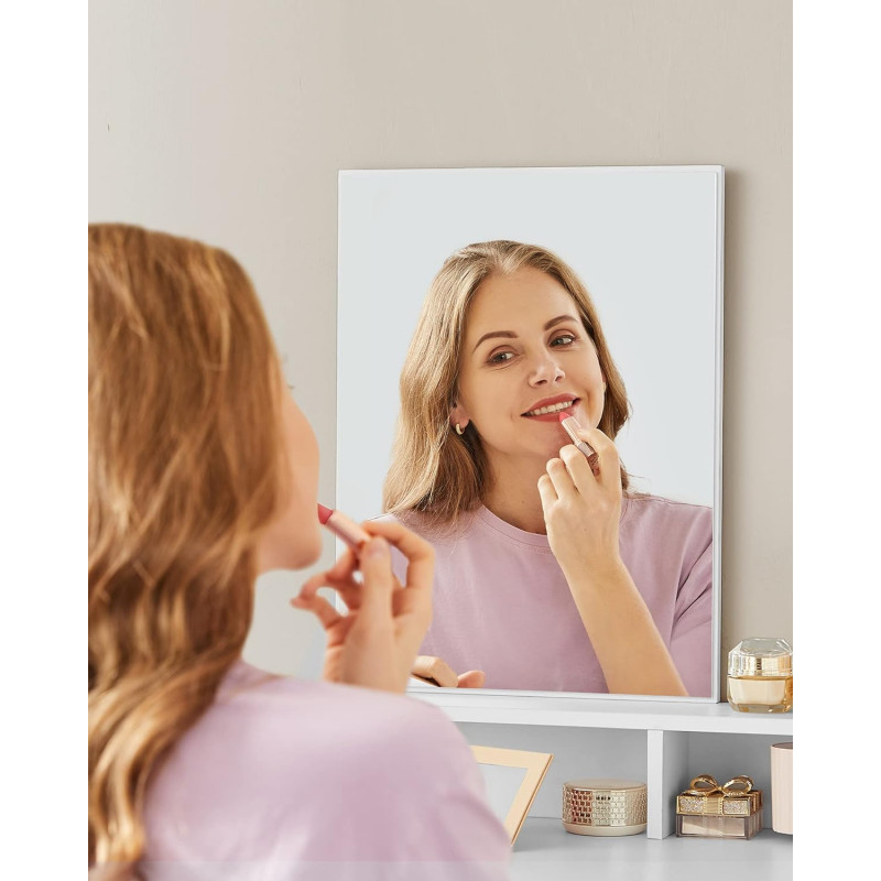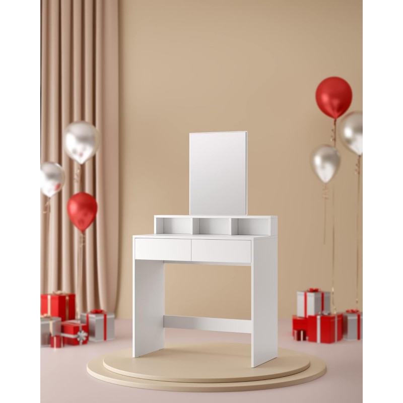 Marca: VASAGLE Despre acest articol Spatioasa, dar care economiseste spatiu: Avand 2 sertare, 1 raft mare si 3 compartimente deschise, aceasta masuta de toaleta ofera o multime de spatiu pentru a va pastra cosmeticele in ordine si la indemana. Ocupand doar 40 x 80 cm de spatiu pe podea, este perfecta pentru spatiile mici.Oglinda mare, transparenta: Oglinda mare de 40 x 53 cm (L x H) a acestei mese de machiaj va permite sa va verificati clar si sa obtineti o aplicare impecabila a machiajului.Kit anti-inclinare pentru o siguranta sporita: Fixati aceasta masa de machiaj la perete cu kitul anti-inclinare furnizat pentru a crea un mediu mai sigur pentru familia dvs.Stil simplu, modern: Designul simplu, liniile curate si culoarea alba eleganta se combina in aceasta masa de machiaj pentru a va infrumuseta dormitorul.Robust si usor de curatat: Fabricata din placi aglomerate de calitate, aceasta masuta de toaleta este robusta si durabila. Suprafata furnirului face ca aceasta masa sa fie rezistenta la uzura pentru o utilizare de lunga durata si usor de curatat.