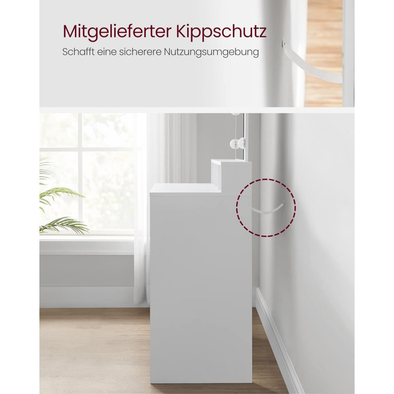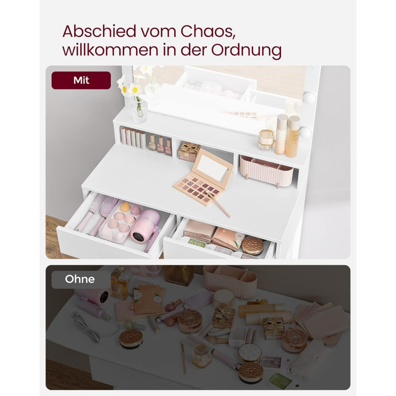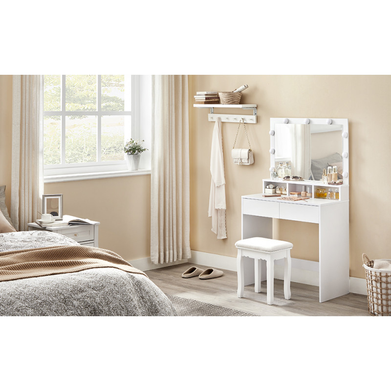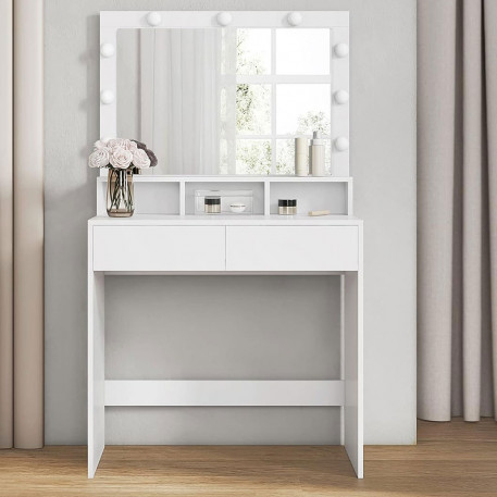 Perfect stilizat: Cele 9 becuri reglabile ale acestei masute de toaleta care inconjoara oglinda pot fi atenuate prin apasarea intrerupatorului si iti lumineaza zona de infrumusetare - astfel incat sa poti evoca un machiaj perfect.O mai buna organizare a produselor dvs. cosmetice: Cele 2 sertare mari si cele 3 compartimente deschise ale masutei de toaleta ofera suficient spatiu pentru machiajul dvs. si faciliteaza organizarea cosmeticelor dvs.Se potriveste perfect: Datorita liniilor curate, a culorii albe si a aspectului modern, aceasta masa de toaleta se potriveste perfect in dormitorul dvs. Intr-un colt sau langa pat? Decizia va apartine.Asamblare usoara: Va punem la dispozitie