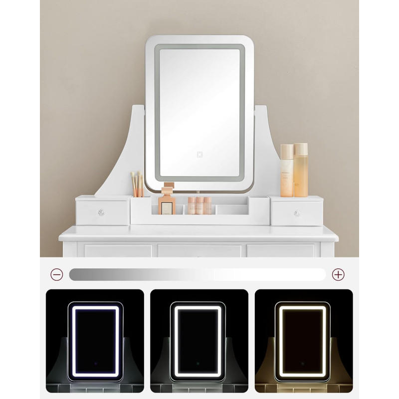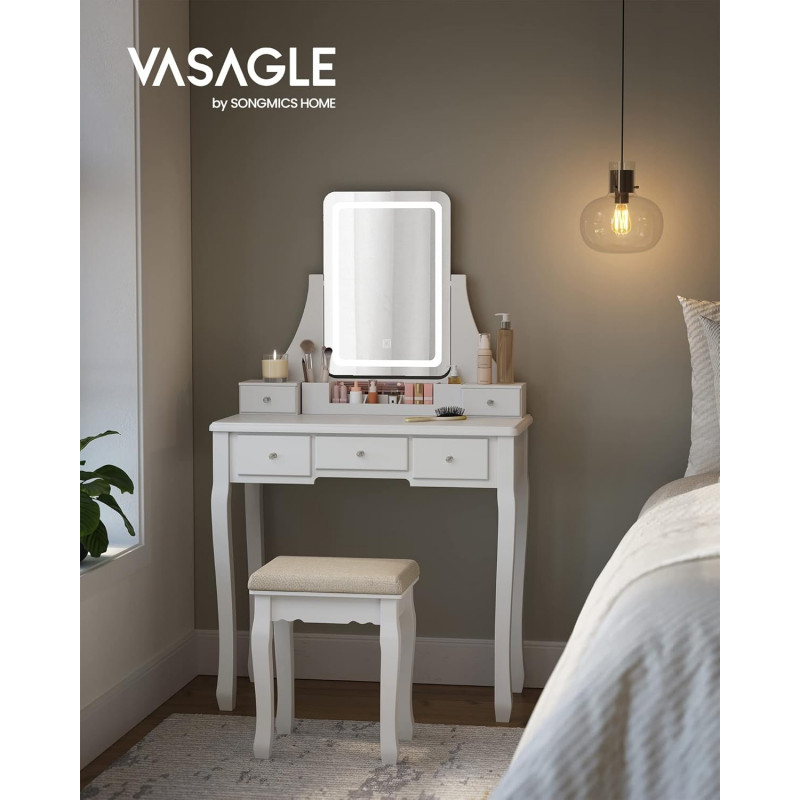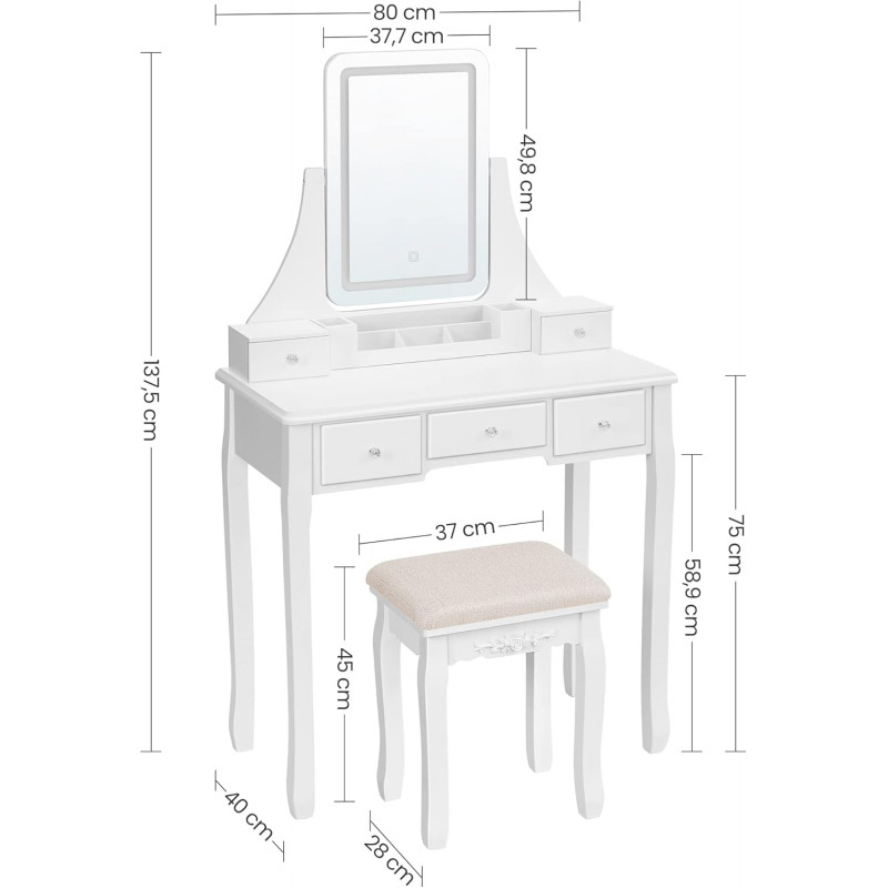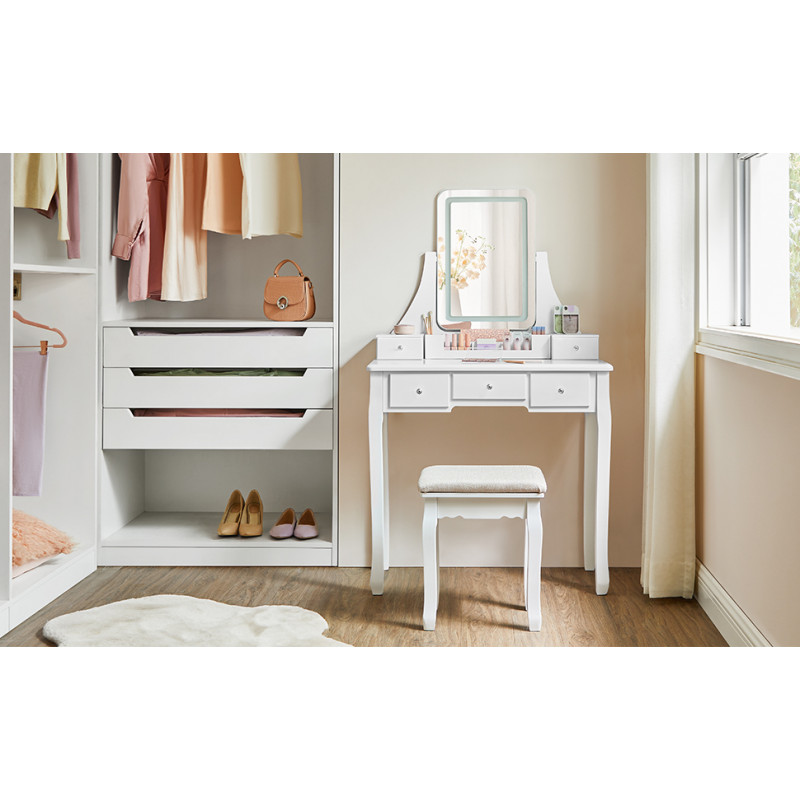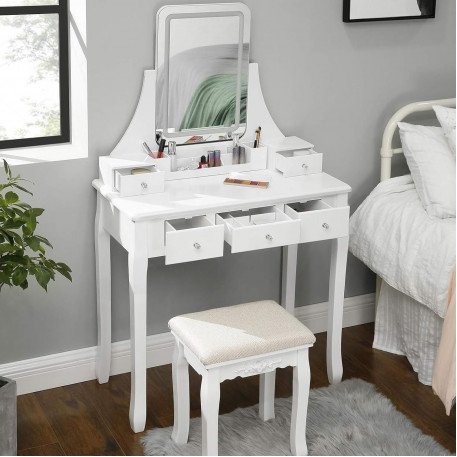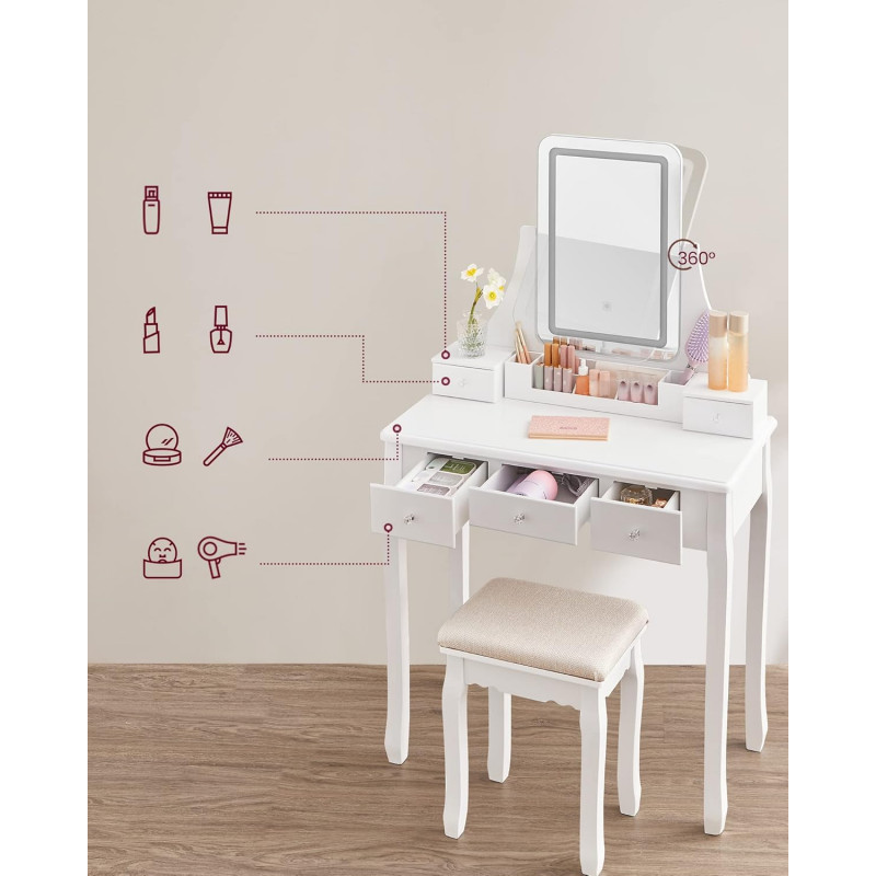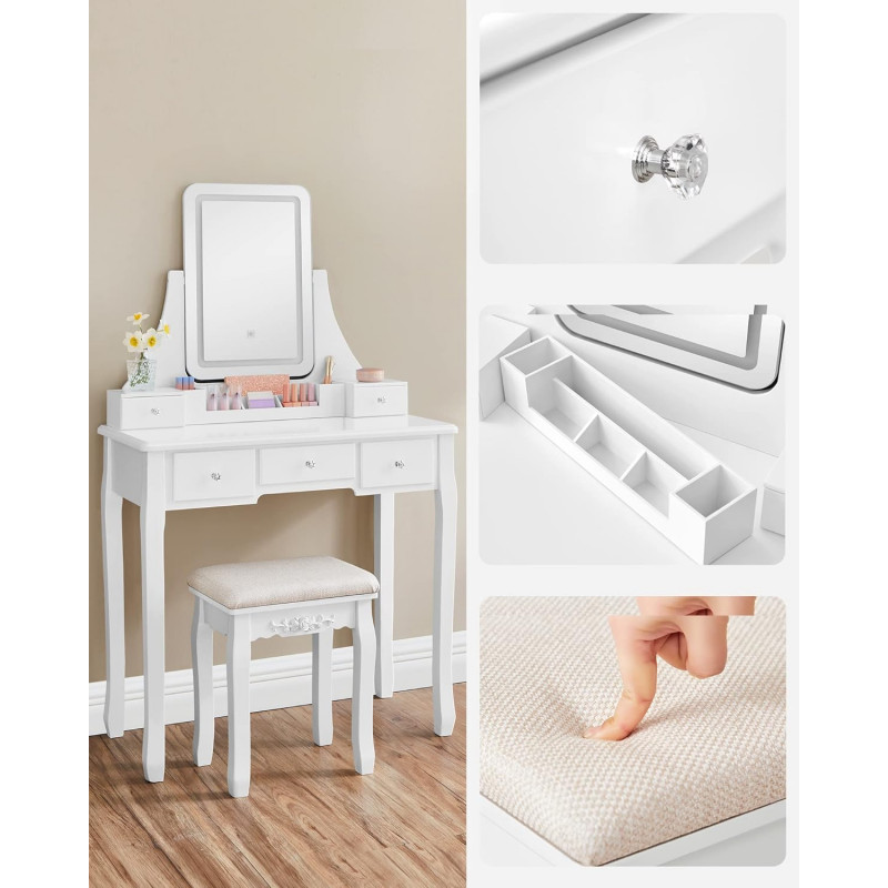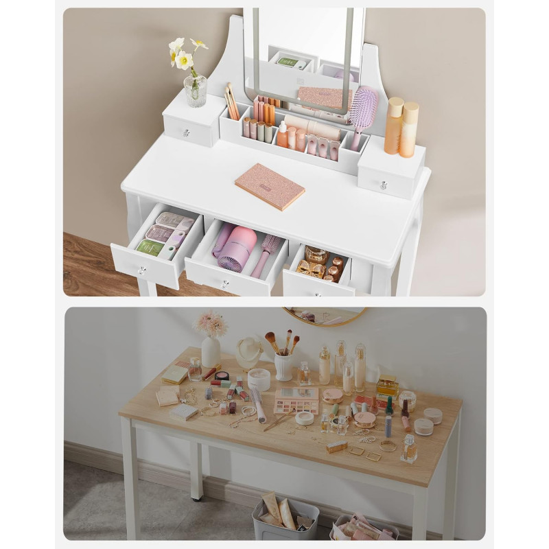 Spatiu suficient: Aceasta masuta de toaleta are 5 sertare, un organizator detasabil cu 6 compartimente deschise de diferite dimensiuni pentru a va pastra toate produsele bine depozitate. Sigur, stabil si confortabil: Protectia la inclinare ataseaza masuta de toaleta la perete pentru un mediu sigur; picioarele mesei din pin si picioarele taburetului din lemn de cauciuc sunt robuste si stabile; puteti sta confortabil pe taburetul captusit.