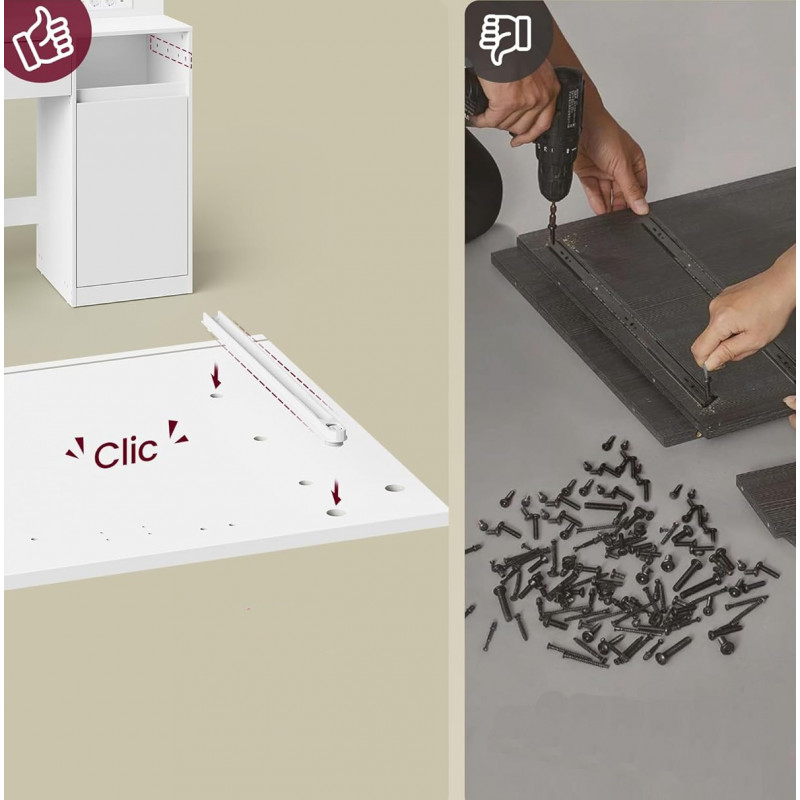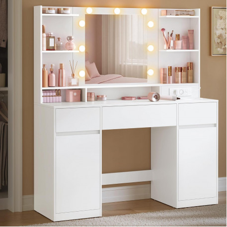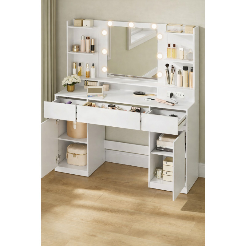 Scurta descriere Masa de toaleta moderna din colectia Kailyn ofera un spatiu complet pentru organizarea produselor de machiaj si accesoriilor. Oglinda cu iluminare LED reglabila si priza integrata asigura confort si functionalitate in utilizarea zilnica. Designul minimalist se potriveste perfect in orice dormitor.