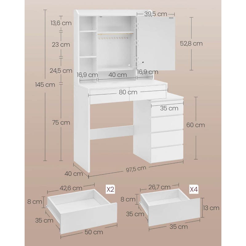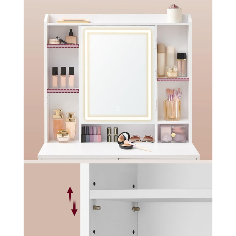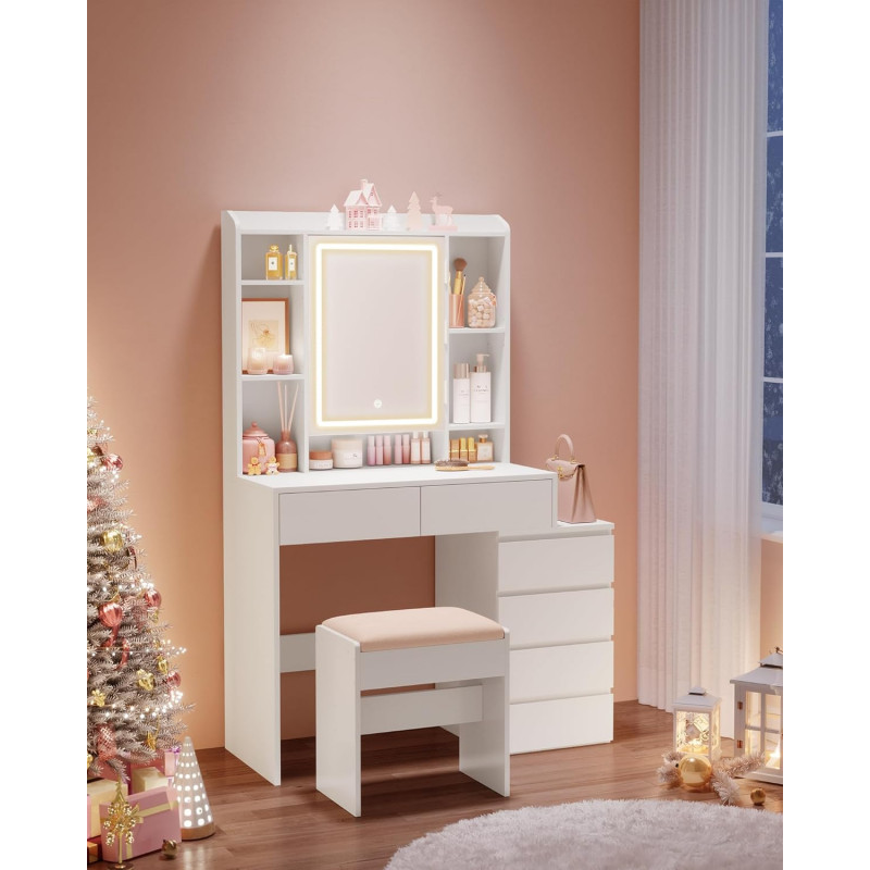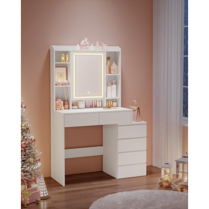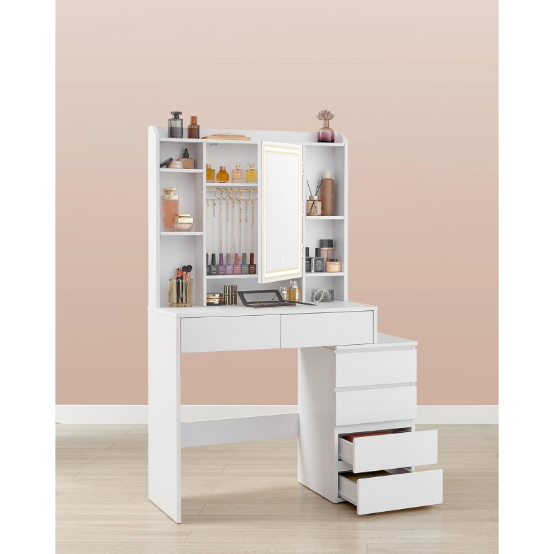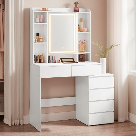 Scurta descriere Masa de toaleta moderna ofera un spatiu generos pentru organizarea produselor de machiaj si accesoriilor. Oglinda cu iluminare LED reglabila permite ajustarea intensitatii si a culorii luminii pentru un machiaj perfect. Designul minimalist se potriveste usor in orice dormitor.