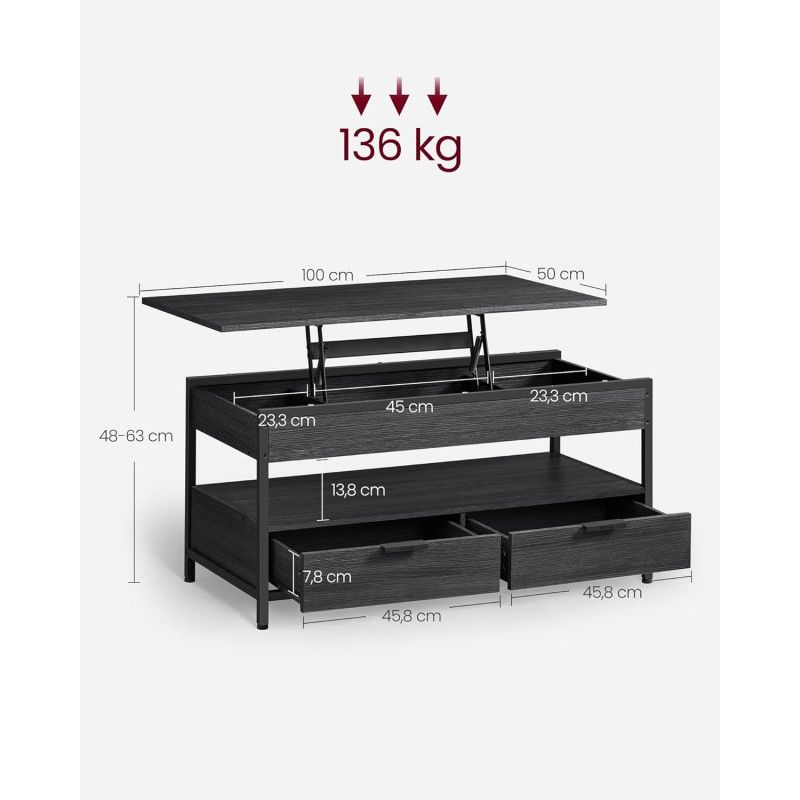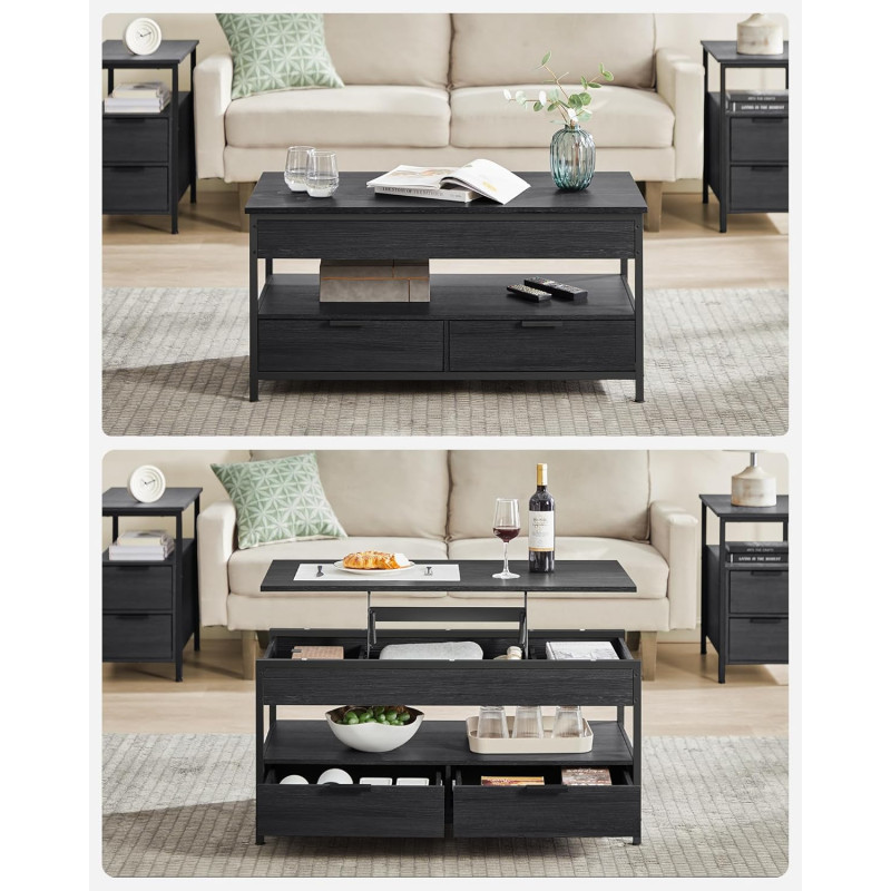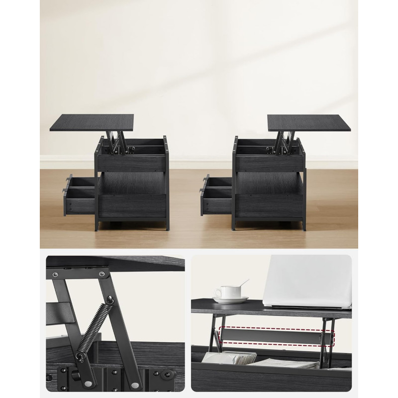 Scurta descriere VASAGLE Masuta de cafea cu blat reglabil combina functionalitatea cu designul industrial modern. Blatul se ridica de la 48 la 63 cm, oferind o pozitie confortabila pentru lucru, masa sau relaxare pe canapea. Spatiile de depozitare includ compartimente ascunse, sertare si o polita deschisa pentru organizare eficienta.