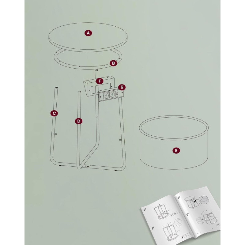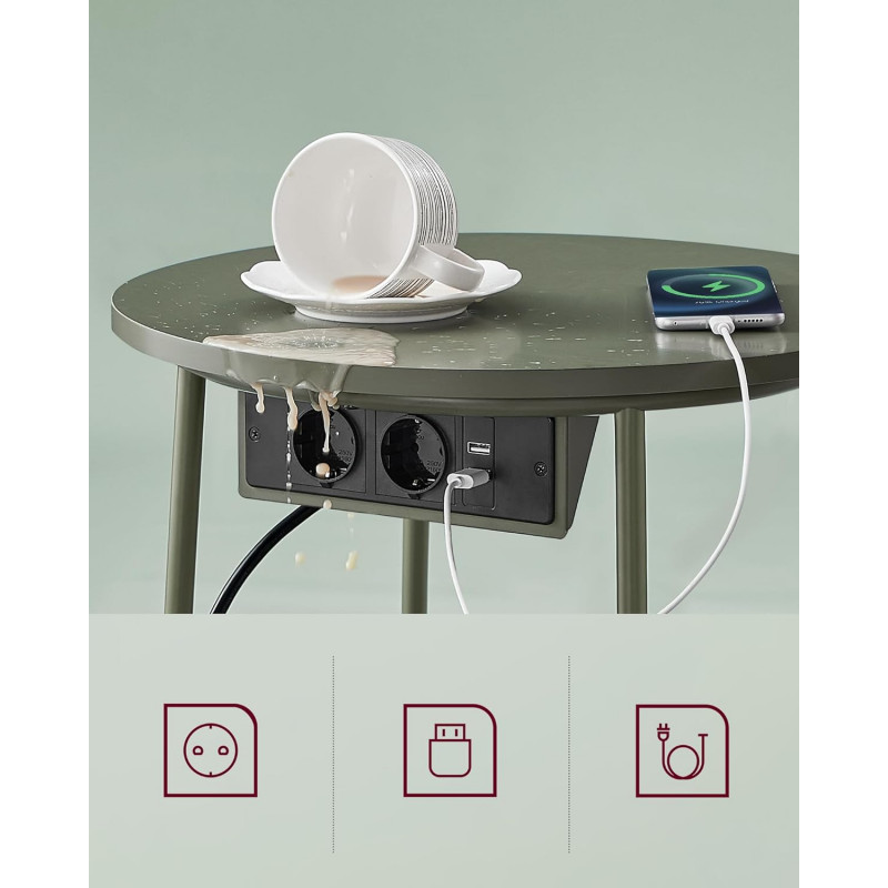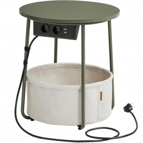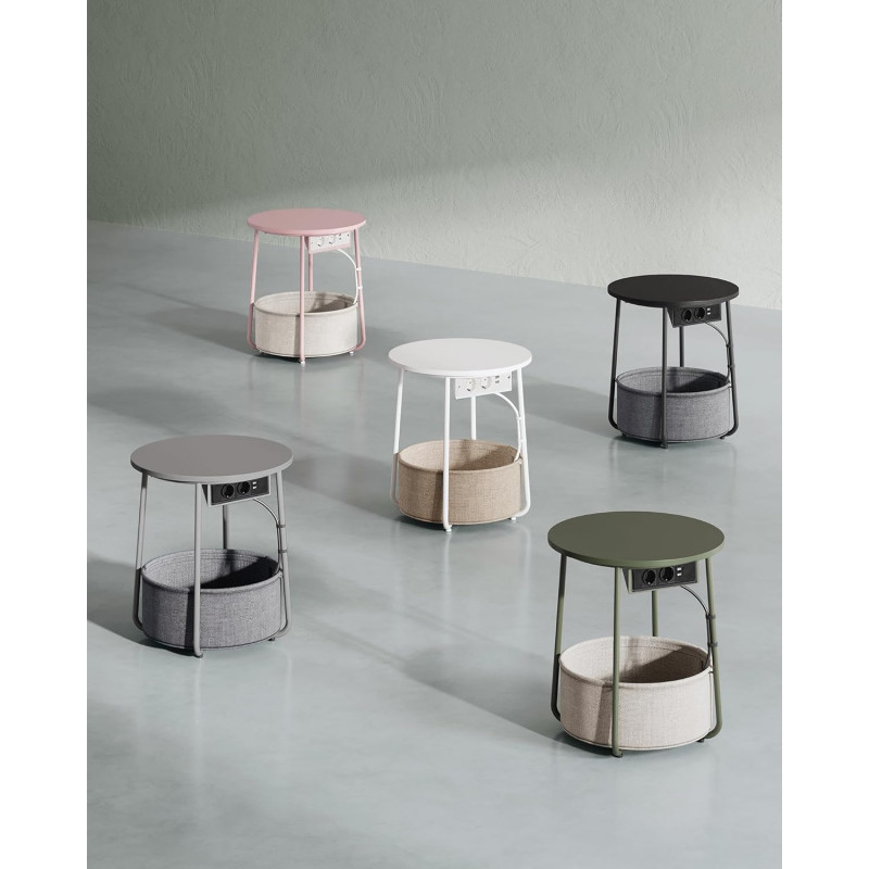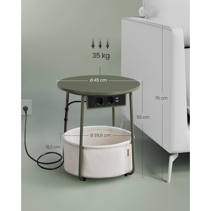 Ce primiti: - 1 x masa laterala.- 1 x cos din tesatura- 1 x pachet de accesorii.- 1 x manual de utilizare Priza convenabila Echipata cu 2 prize si 2 porturi USB sub tava, aceasta masa laterala rotunda va ajuta sa va incarcati lampa, telefonul mobil, tableta si alte dispozitive, astfel incat sa nu fiti nevoit sa cautati alte prize Ideal pentru camere mici Cu dimensiunile sale compacte de 45 x 50 cm (diametru x inaltime), aceasta masuta cu cos se potriveste bine in camerele mici. Ca masa laterala in camera de zi sau ca noptiera in dormitor, ocupa putin spatiu, oferind in acelasi timp si spatiu de depozitare. Stabila si robusta Placa de particule robusta poate fi fixata ferm si fara sa se clatine pe cadru. Picioarele U din otel dintr-o singura bucata ofera un suport puternic. Picioarele reglabile cresc stabilitatea si va protejeaza podeaua de zgarieturi Cos de inalta calitate Cosul este fabricat din tesatura neteda din poliester cu strat dublu si arata frumos. De asemenea, nu are acoperire chimica si asigura o utilizare sigura. Datorita aspectului de textil, aceasta masa de cafea confera o nota unica Usor de asamblat Datorita structurii simple, pieselor etichetate si