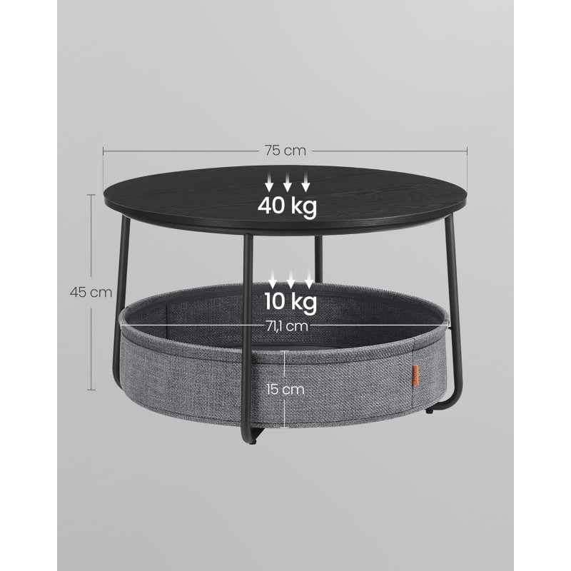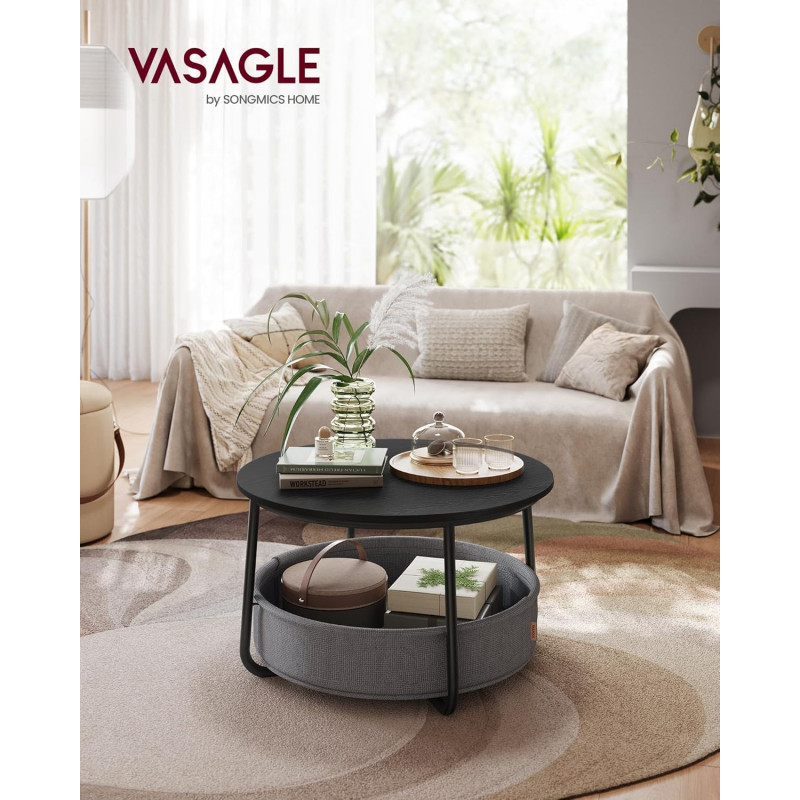 Scurta descriere Aceasta masuta de cafea VASAGLE imbina perfect stilul modern cu functionalitatea. Designul rotund si finisajele elegante in negru ink si gri slate se potrivesc usor in orice living. Cosul textil dublu, cu o capacitate generoasa de 22 de galoane, permite depozitarea pernelor, paturilor sau cartilor. Blatul din MDF si cadrul metalic in forma de U asigura o structura stabila si durabila.