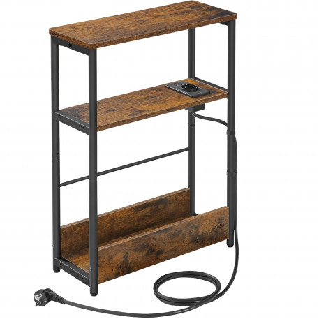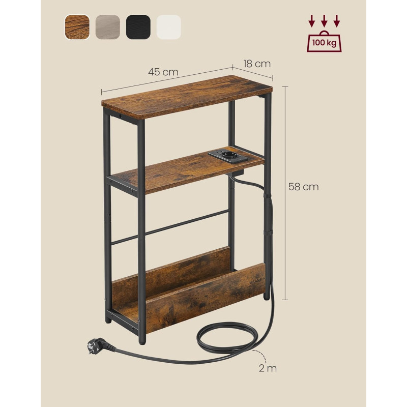 Scurta descriere: Aceasta masa laterala VASAGLE este solutia perfecta pentru spatii restranse, avand o latime de doar 18 cm. Dotata cu statie de incarcare integrata (1 port AC si 2 porturi USB), este ideala pentru dormitor, birou sau living. Cu 3 rafturi si suport lateral pentru reviste, ofera spatiu practic de depozitare.